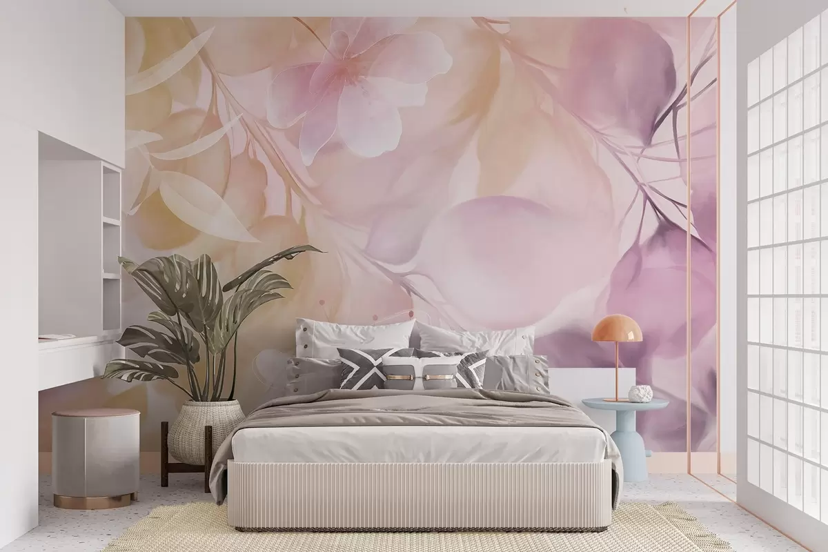 Fototapeter Blomsterkunst med dempede gule og lilla blomster, blader og grener, myke pastellfarger, akvarellstrukturert effekt Nr. w09397v2