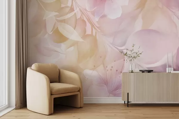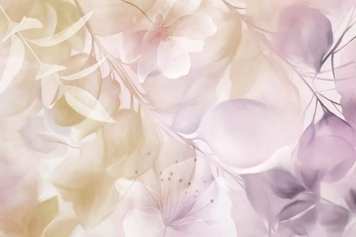 Fototapeter Blomsterkunst med dempede gule og lilla blomster, blader og grener, myke pastellfarger, akvarellstrukturert effekt Nr. w09397v2