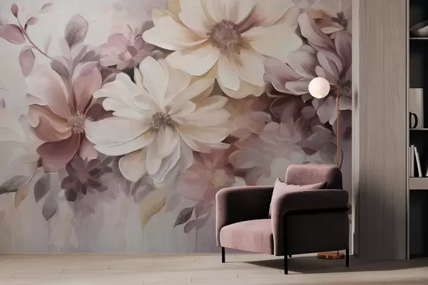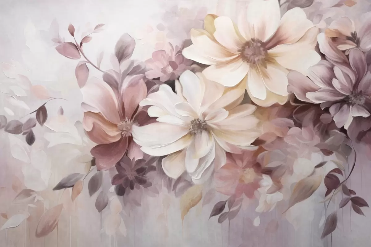 Fototapeter Et blomsterarrangement med store, myke blomster i burgunder, fersken og hvitt, med delikate blader Nr. w09398