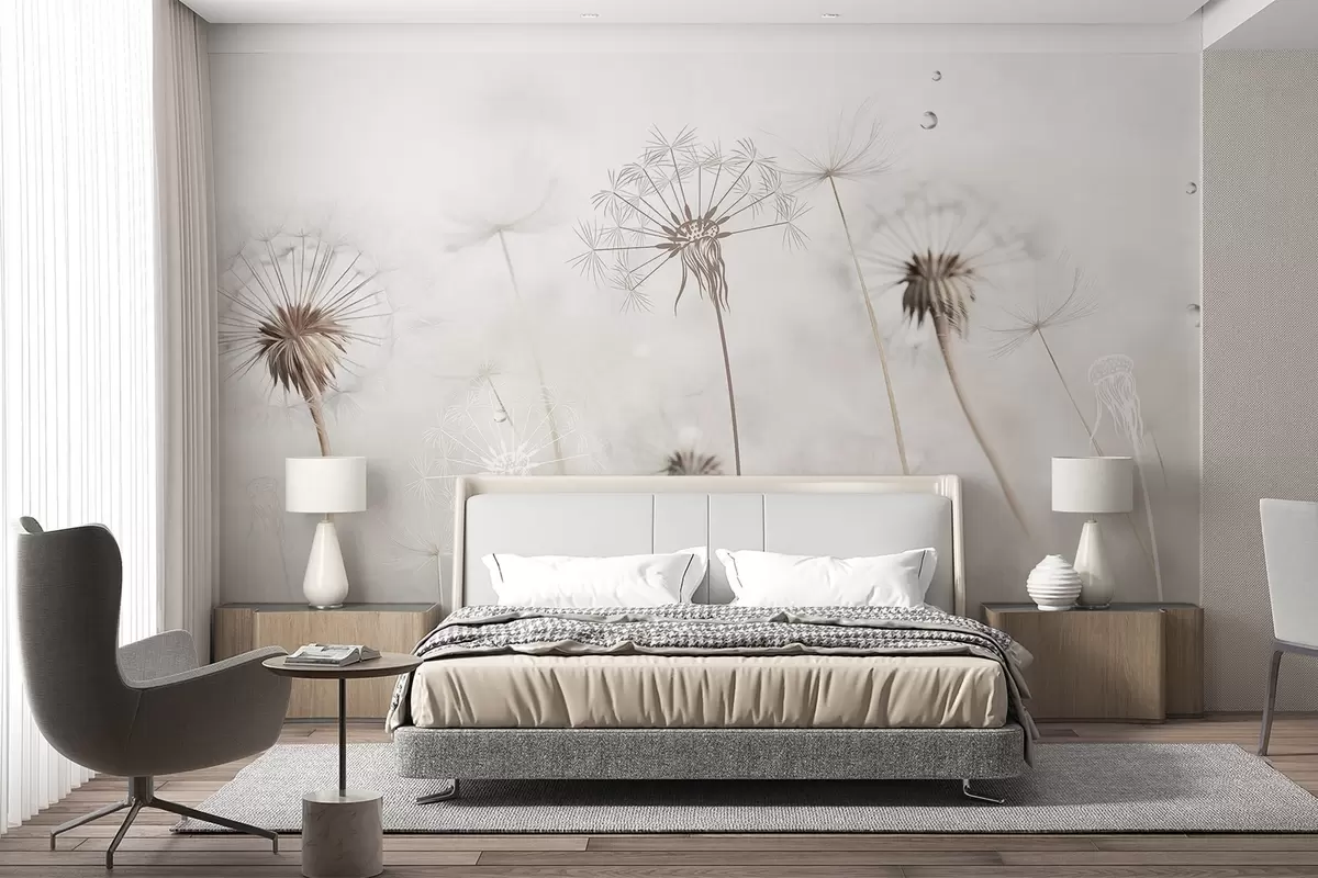 Fototapeter Løvetann med vanndråper, hvit bakgrunn, nærbilde, mykt lys, natur, botanisk, eterisk, delikat, minimalistisk Nr. w09399