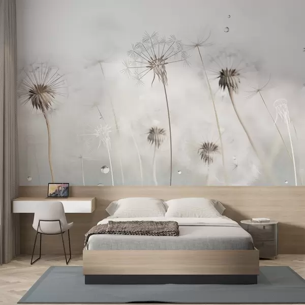 Fototapeter Løvetann med vanndråper, hvit bakgrunn, nærbilde, mykt lys, natur, botanisk, eterisk, delikat, minimalistisk Nr. w09399