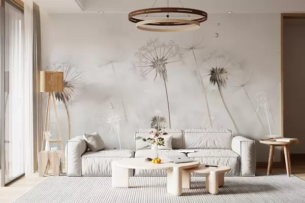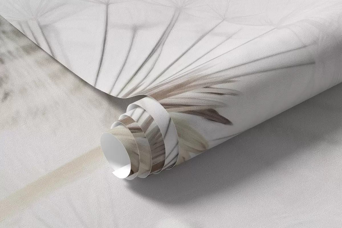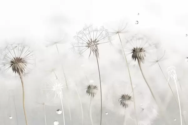 Fototapeter Løvetann med vanndråper, hvit bakgrunn, nærbilde, mykt lys, natur, botanisk, eterisk, delikat, minimalistisk Nr. w09399