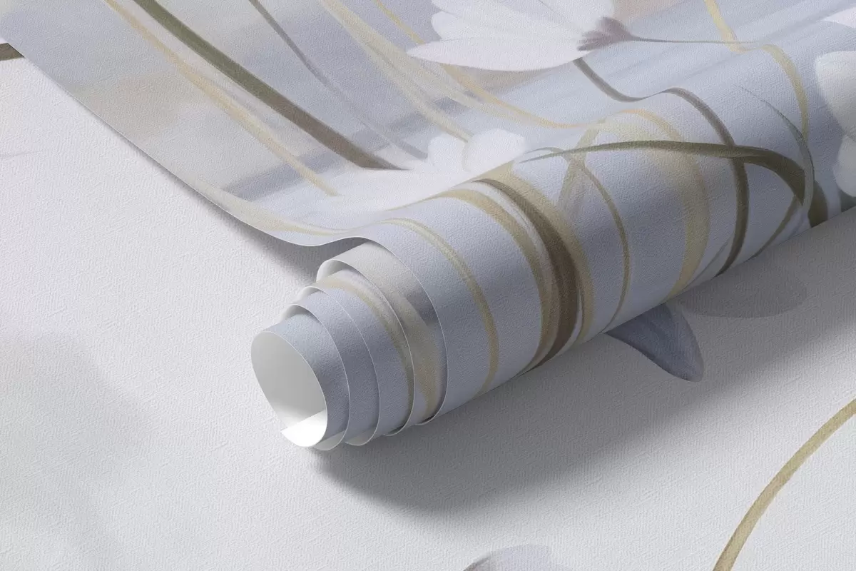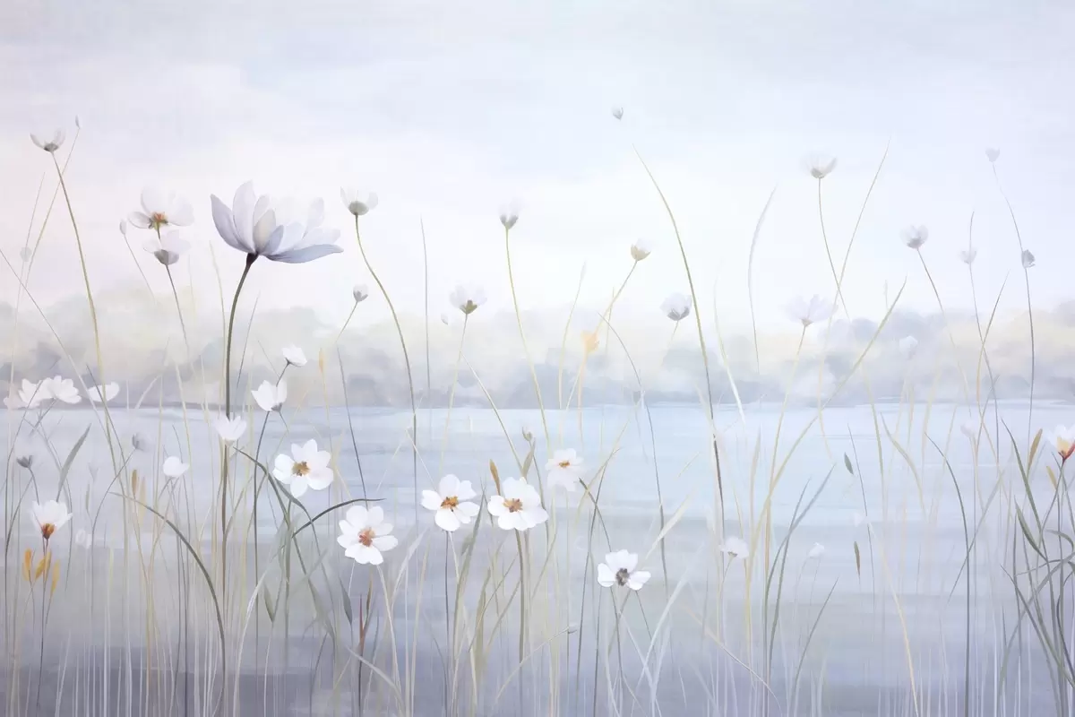 Fototapeter Hvite blomster med lange stilker i et felt, lyseblå himmel, myke farger, strukturert, minimalistisk stil, naturinspirert, rolig bakgrunn Nr. w09401
