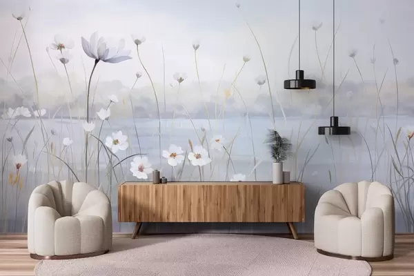 Fototapeter Hvite blomster med lange stilker i et felt, lyseblå himmel, myke farger, strukturert, minimalistisk stil, naturinspirert, rolig bakgrunn Nr. w09401