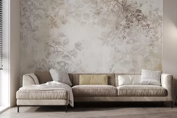 Fototapeter Vintage teksturert blomsterkunst med tegninger av delikate hageblomster og bladillustrasjoner, myke pastellbeige og sepiafarger Nr. w09402