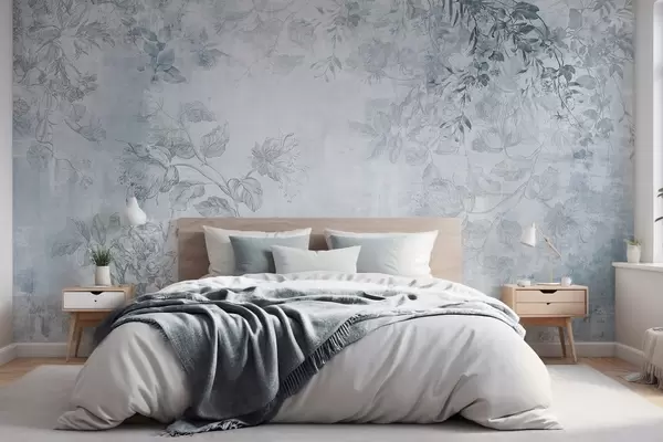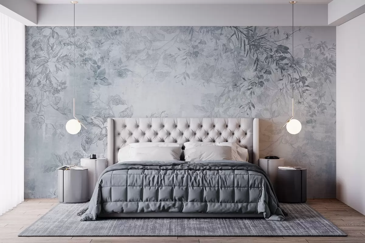 Fototapeter Vintage teksturert blomsterkunst med tegninger av delikate hageblomster og bladillustrasjoner, myke blå toner Nr. w09402v1