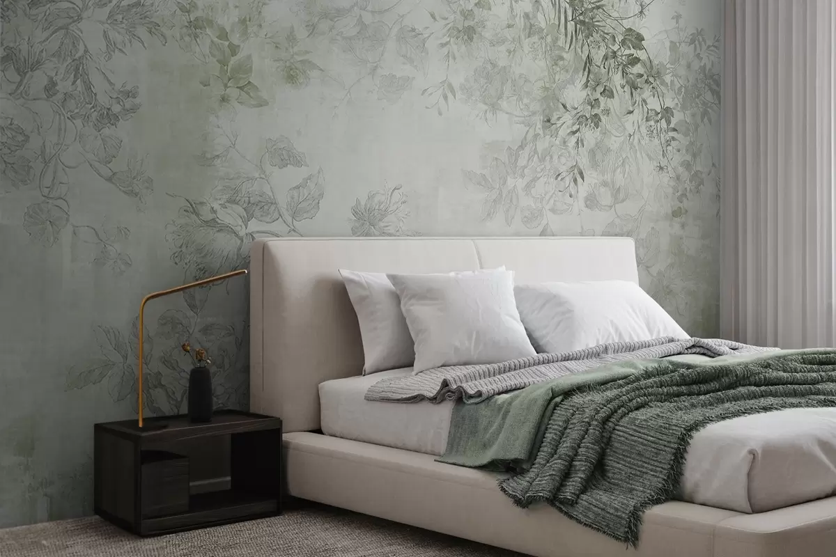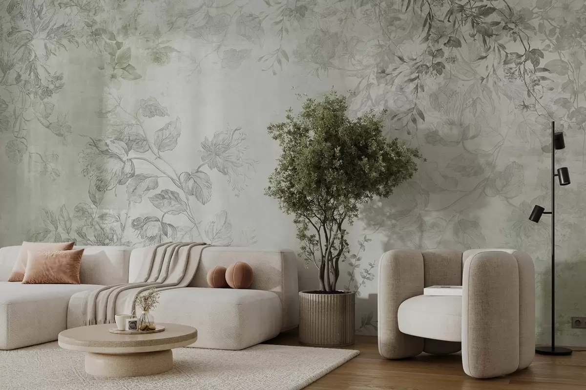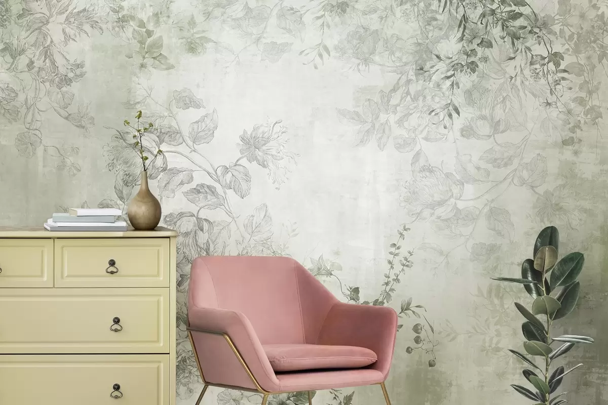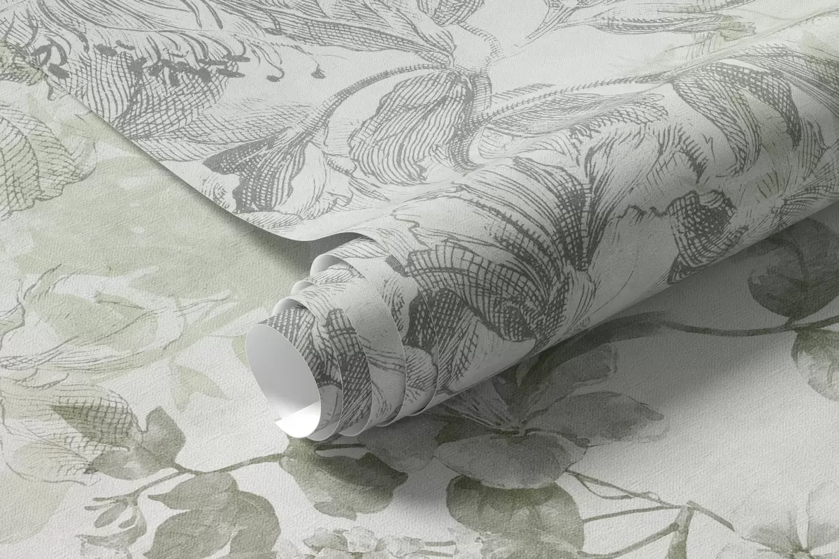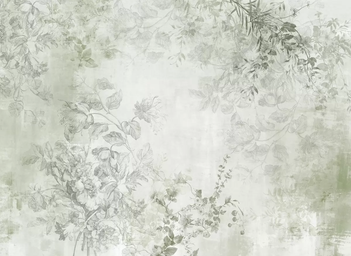 Fototapeter Vintage teksturert blomsterkunst med tegninger av delikate hageblomster og bladillustrasjoner, myke grønne toner Nr. w09402v2
