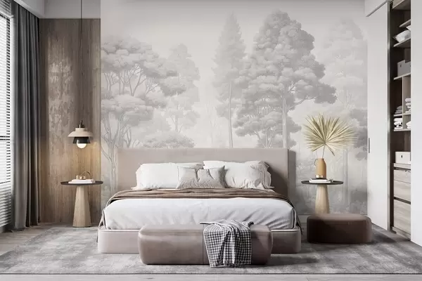 Fototapeter Kunstnerisk skoglandskap i teknikken svart-hvitt grafisk skravering Nr. w09411