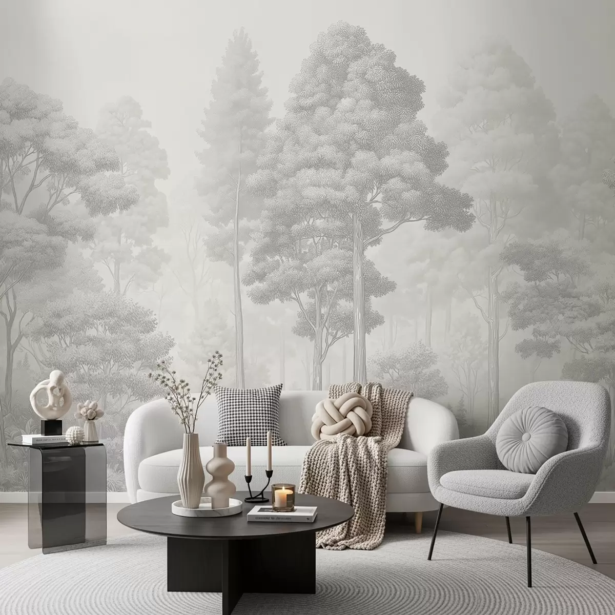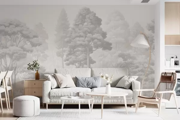 Fototapeter Kunstnerisk skoglandskap i teknikken svart-hvitt grafisk skravering Nr. w09411