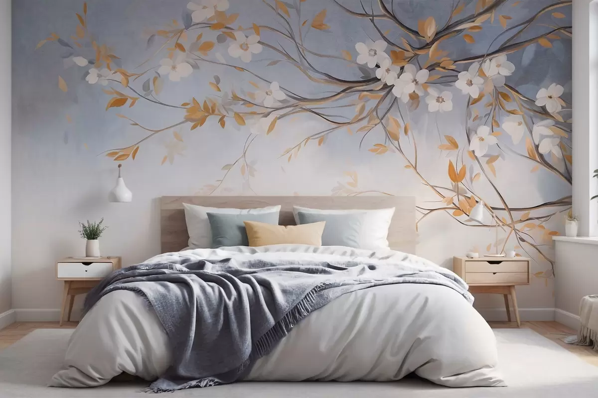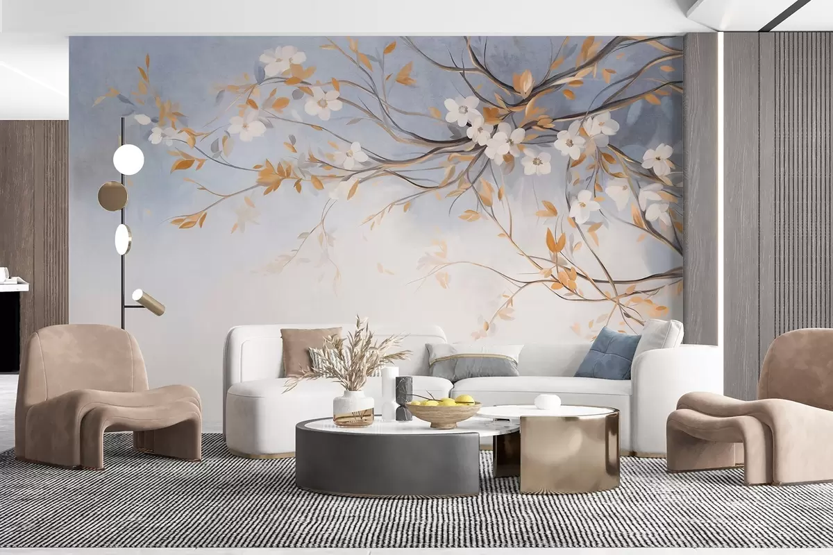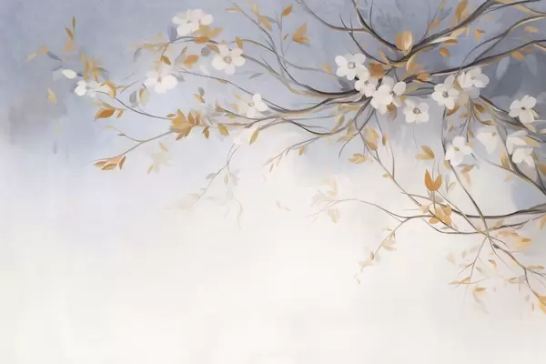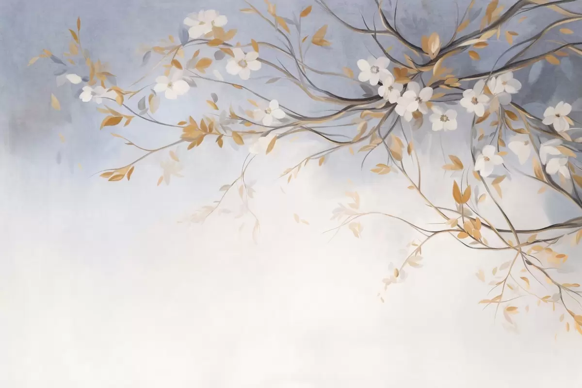 Fototapeter Hvite blomster med oransje blader på en gren, lyseblå strukturert bakgrunn, delikate penselstrøk Nr. w09415
