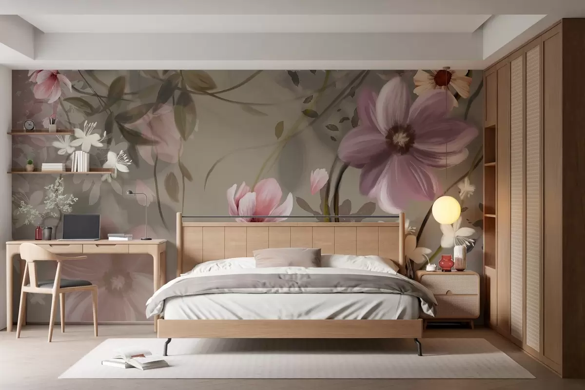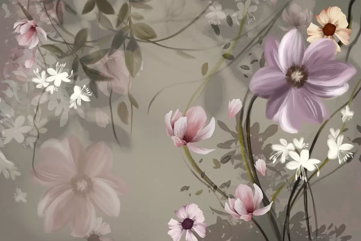 Fototapeter Rosa og hvite blomster med brune stilker og blader, dempet belysning, dempede farger, blomsteroppsats Nr. w09417