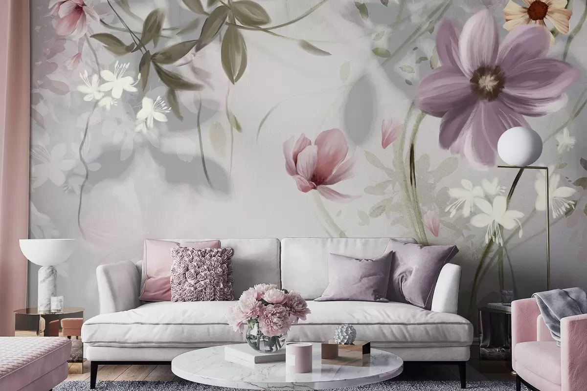Fototapeter Rosa og hvite blomster med grønne stilker og blader, dempet belysning, dempede farger, blomsteroppsats Nr. w09417v1
