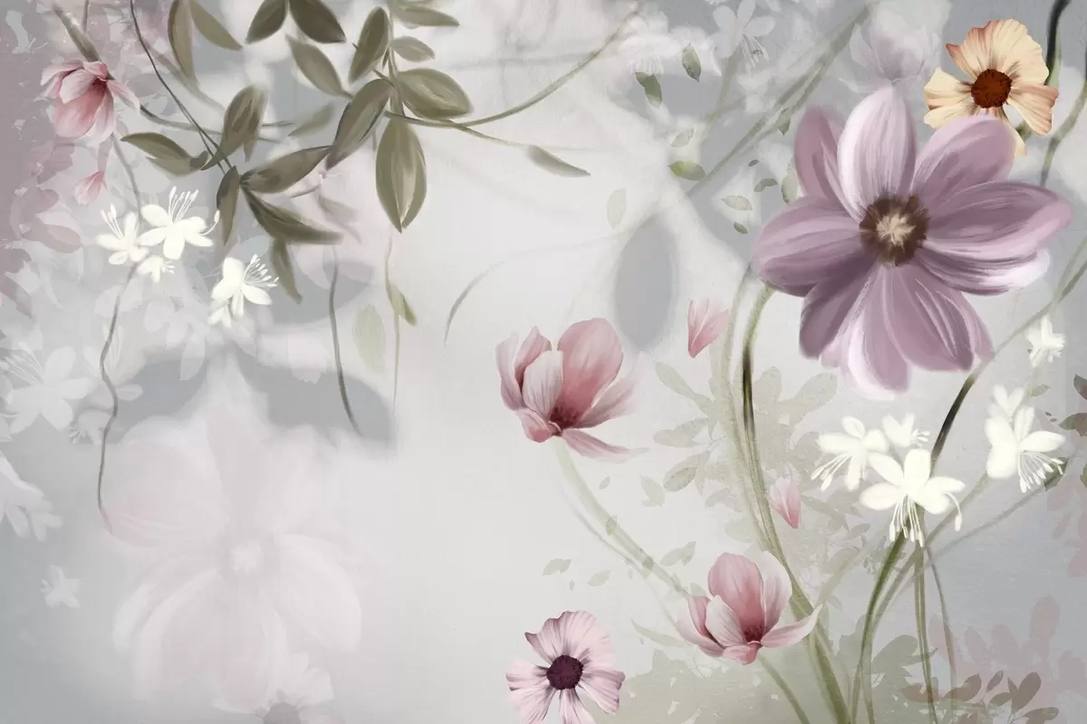 Fototapeter Rosa og hvite blomster med grønne stilker og blader, dempet belysning, dempede farger, blomsteroppsats Nr. w09417v1