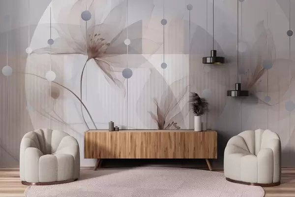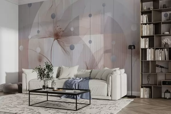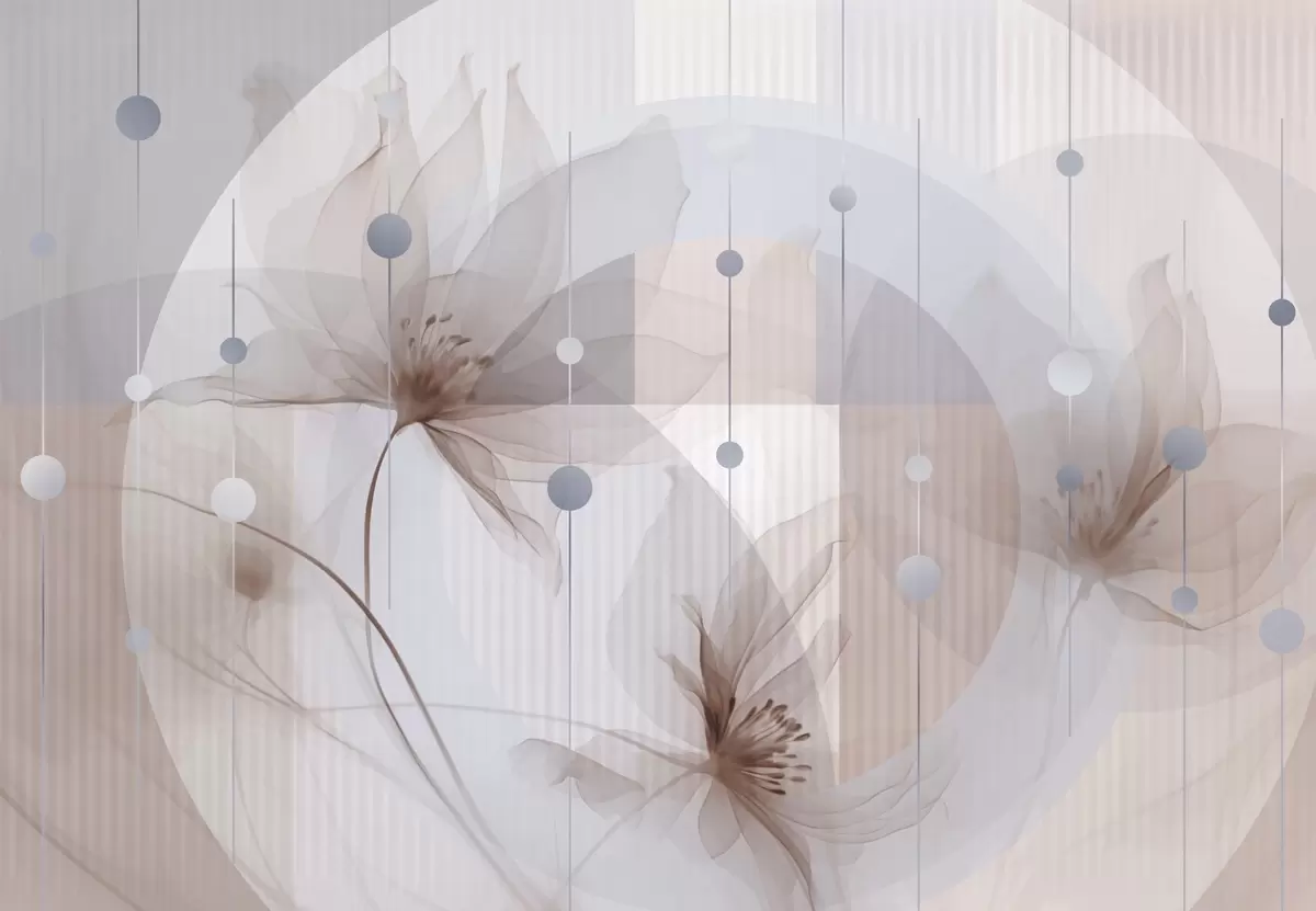 Fototapeter Abstrakte gjennomsiktige blomster, sirkler og geometriske former, pastellblå, brun og hvit fargepalett Nr. w09419v1