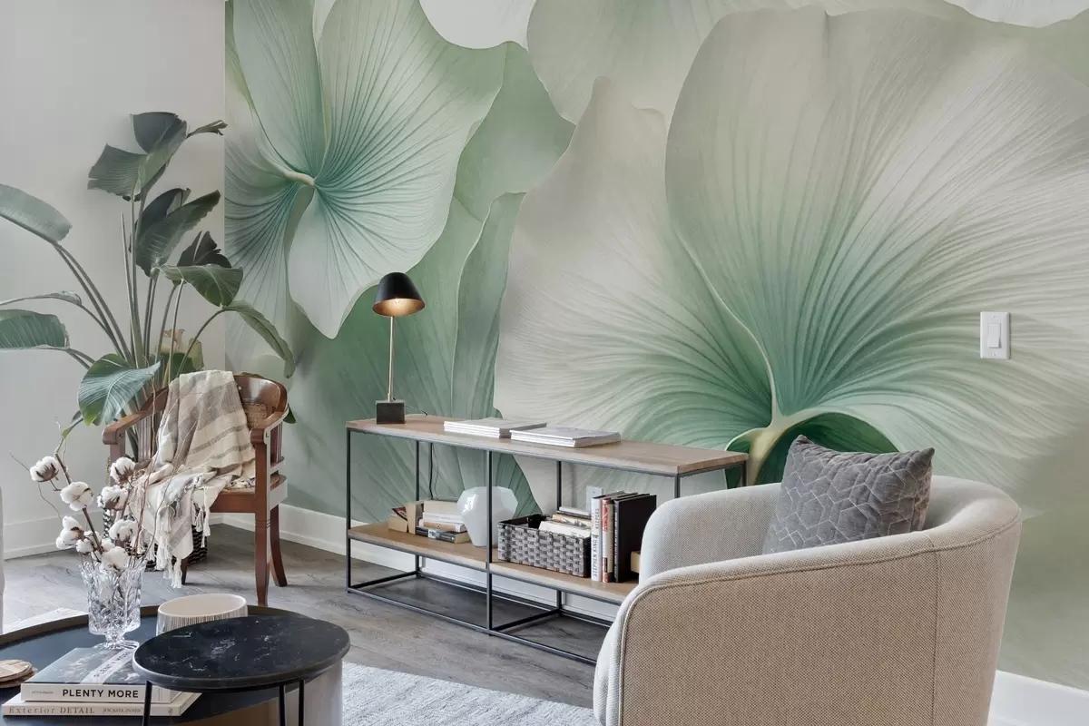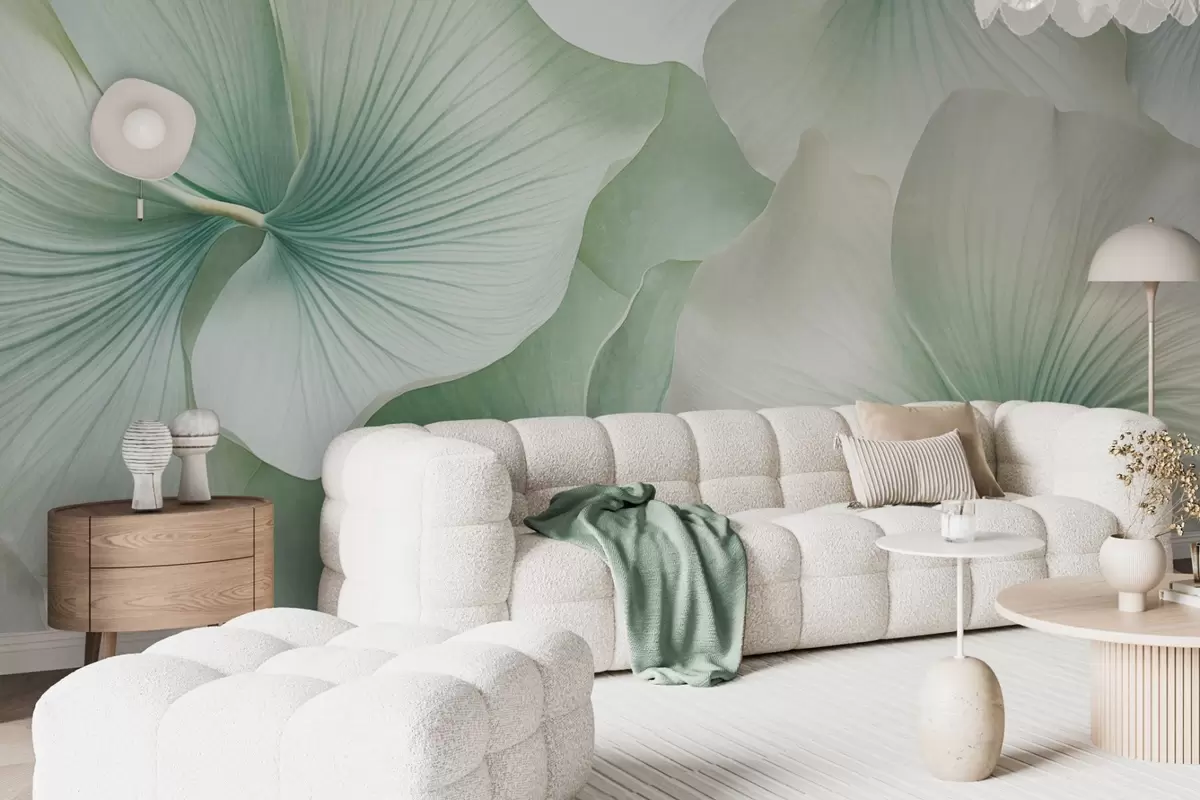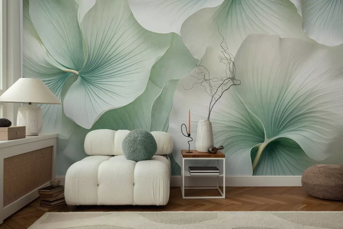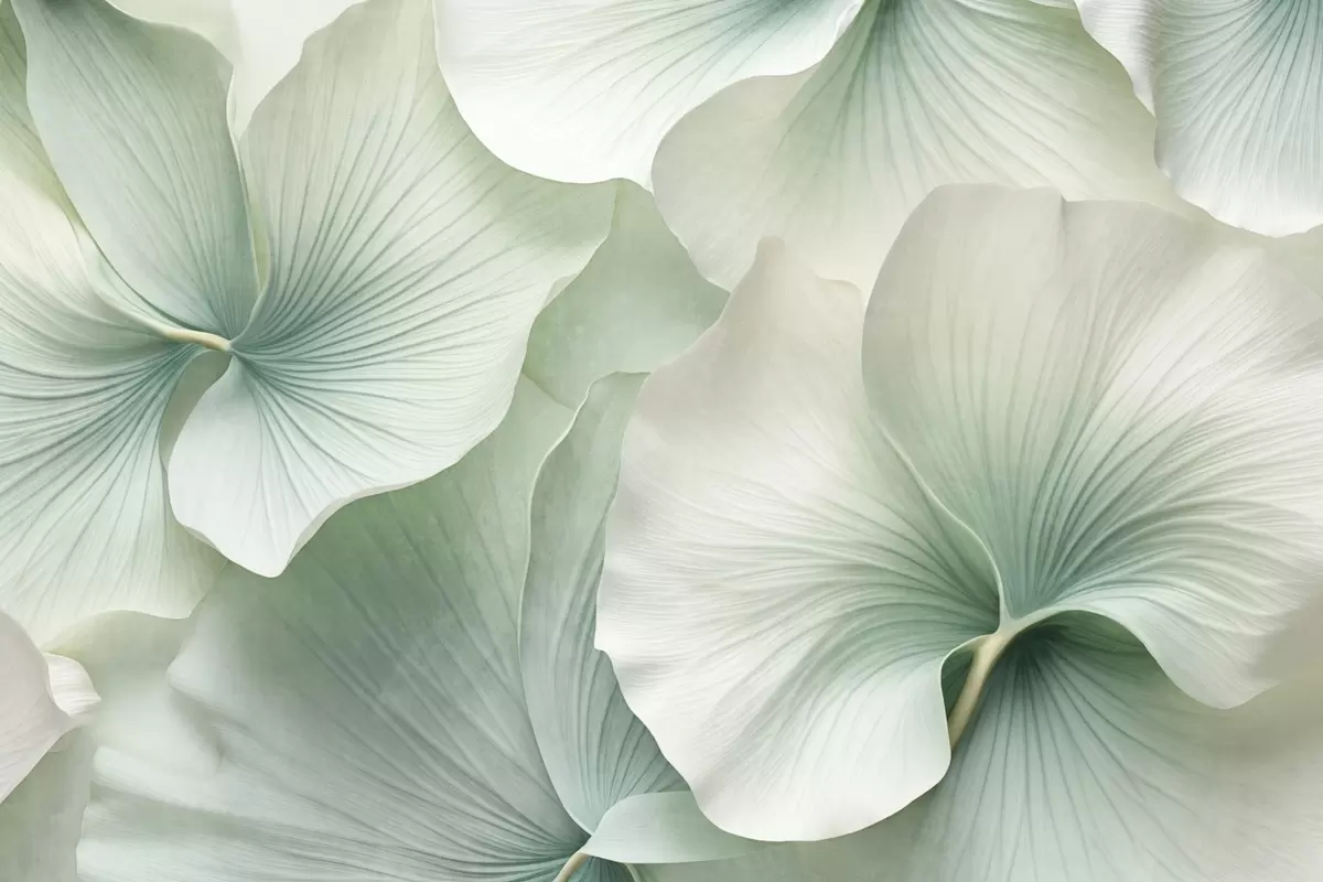 Fototapeter Hvite og grønne gingko-blader, myk tekstur, abstrakt blomsterbakgrunn, minimalistisk moderne stil Nr. w09421