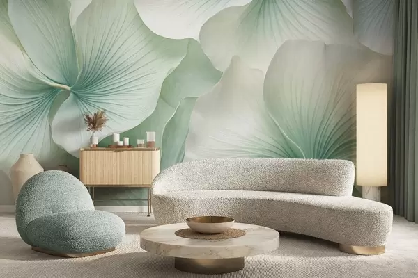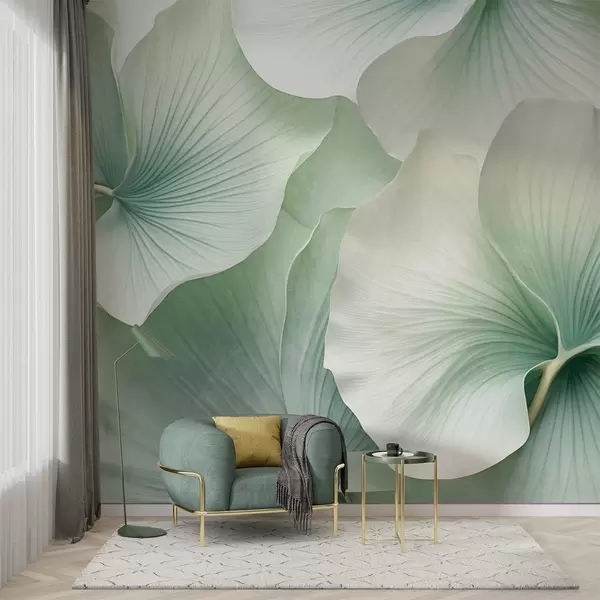 Fototapeter Hvite og grønne gingko-blader, myk tekstur, abstrakt blomsterbakgrunn, minimalistisk moderne stil Nr. w09421