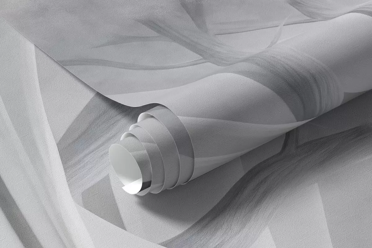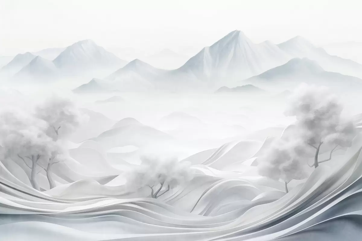 fototapeter Snødekt abstrakt dekorativt fjellandskap med hvite trær og tåke, minimalistisk strukturert stil w09426