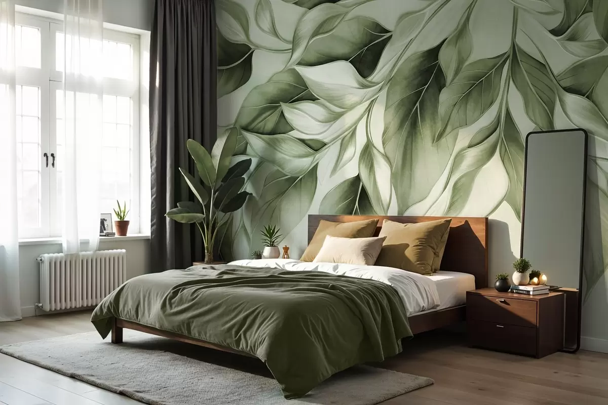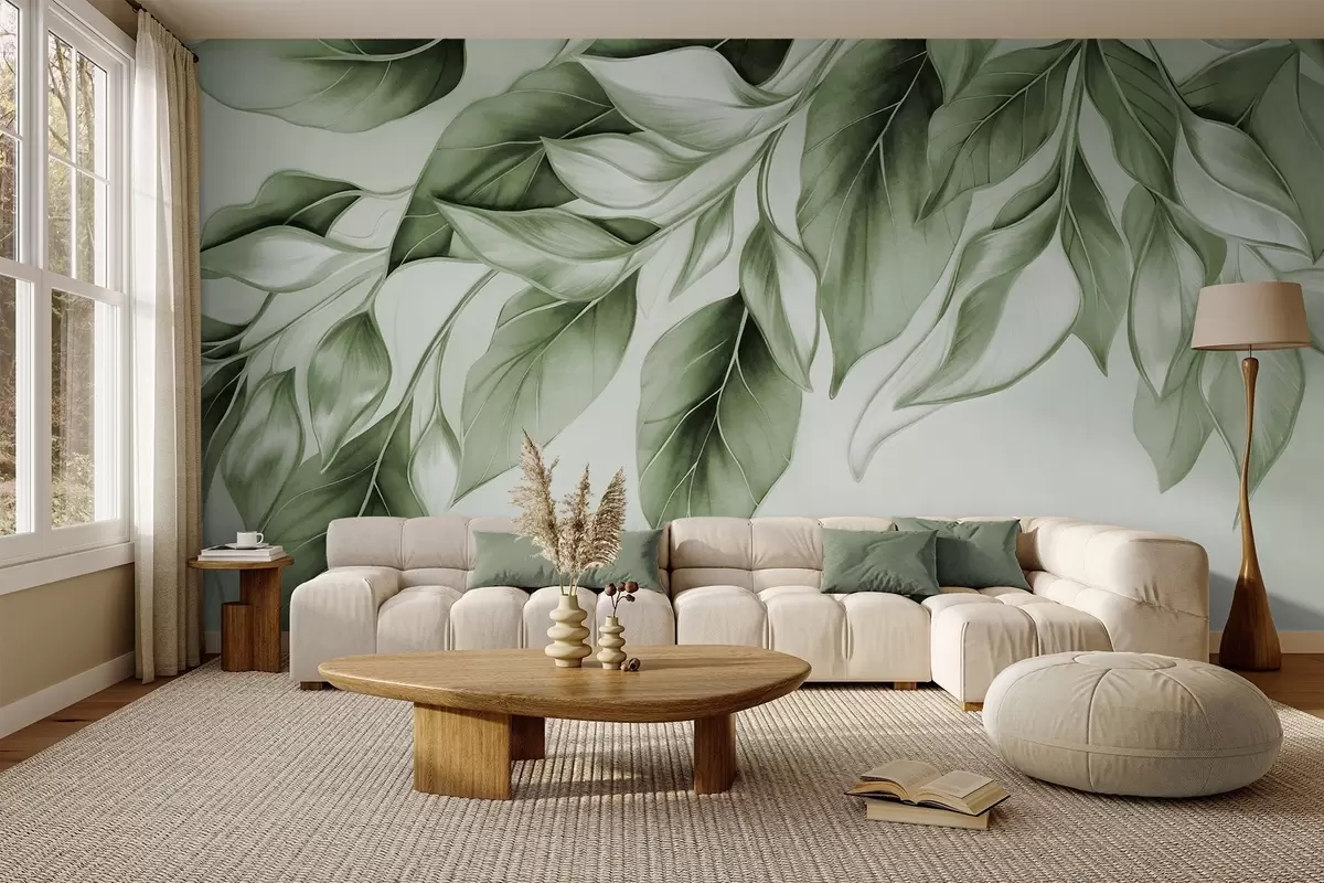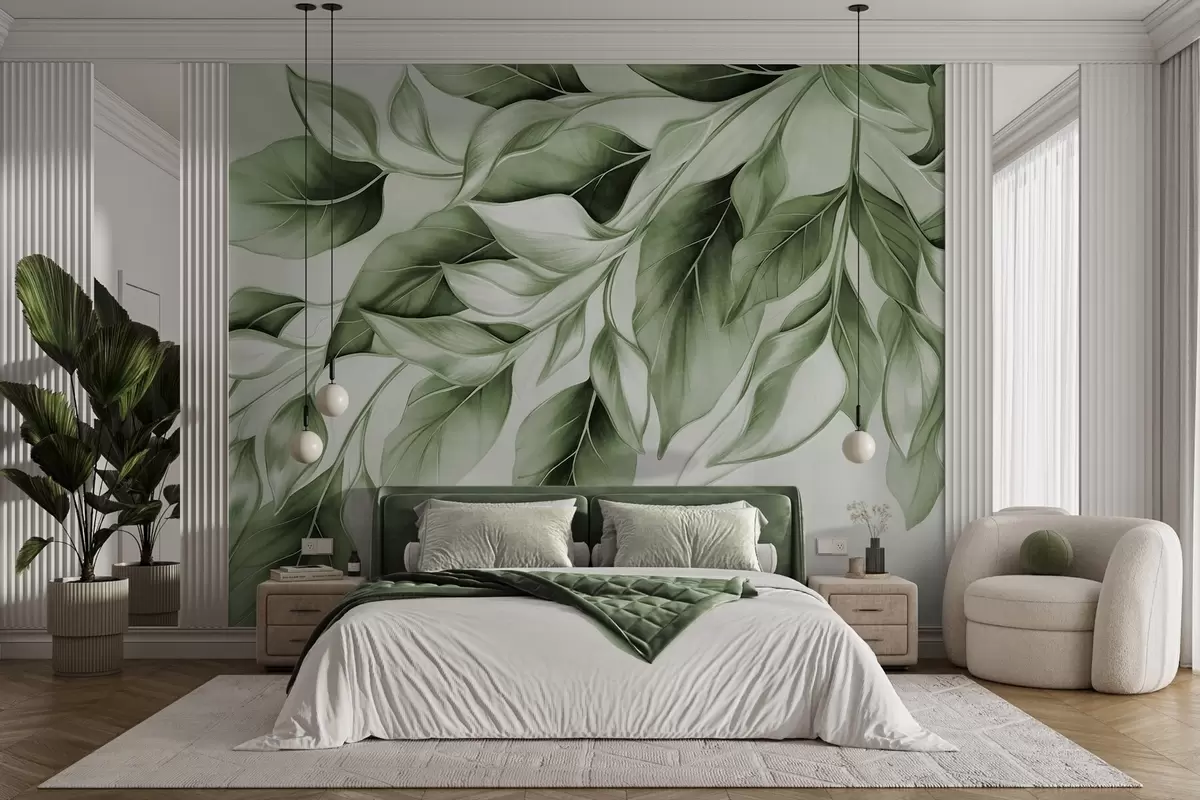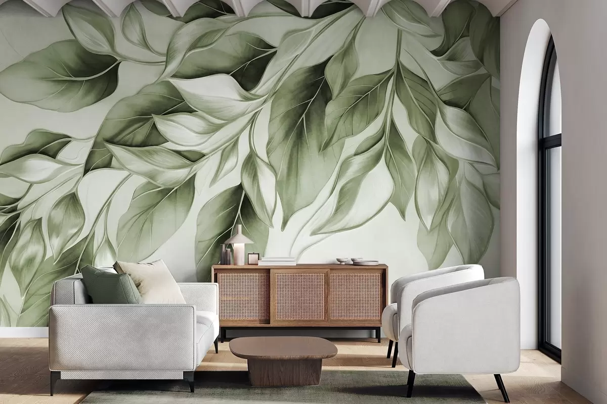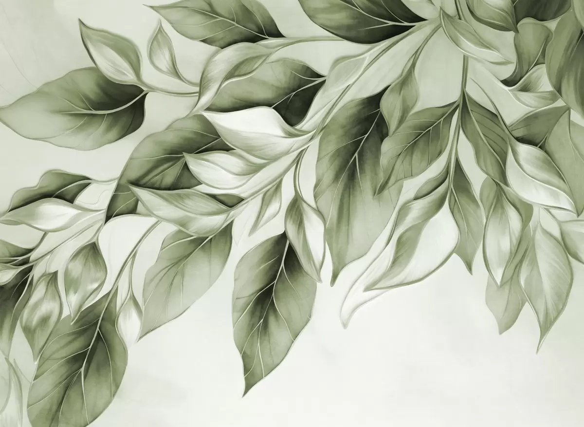 Fototapeter Teksturerte, dempede grønne blader, lys bakgrunn, elegant og kunstnerisk design, moderne stil Nr. w09429v1