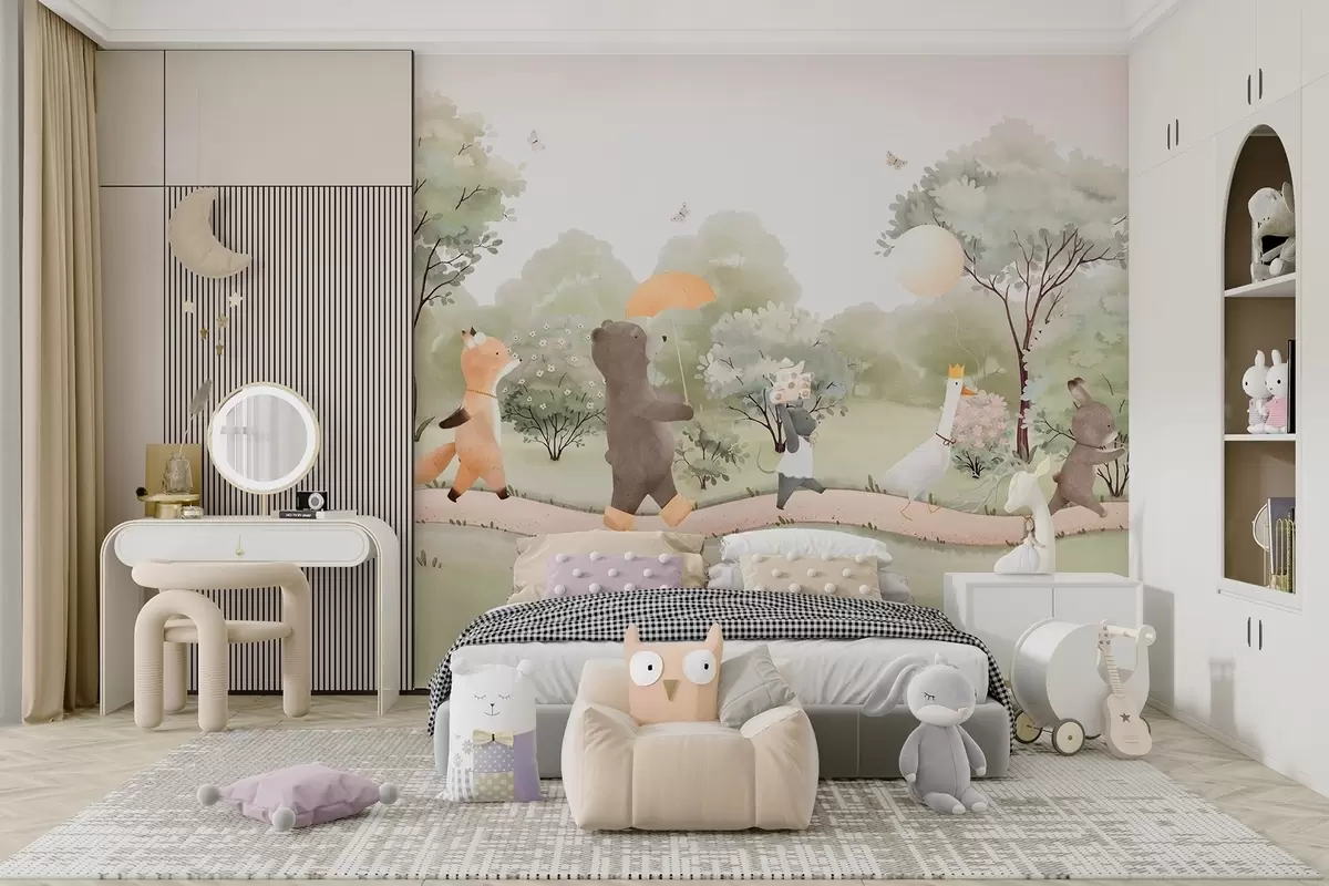 Fototapeter Festlig reise med små dyr gjennom skogen i akvarellstil Nr. w09440