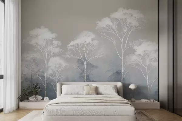 Fototapeter Minimalistiske trær i blågrå farger, i tåke Nr. w09448