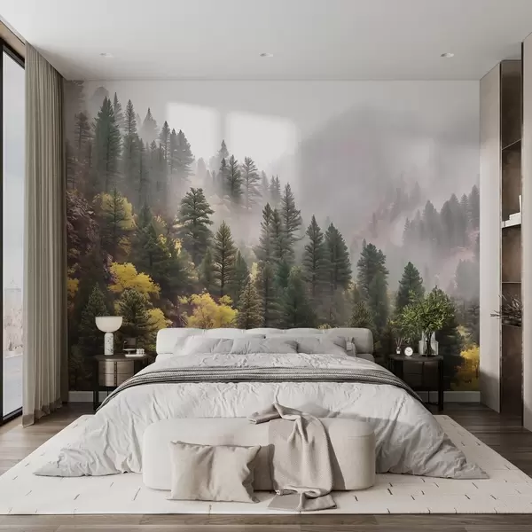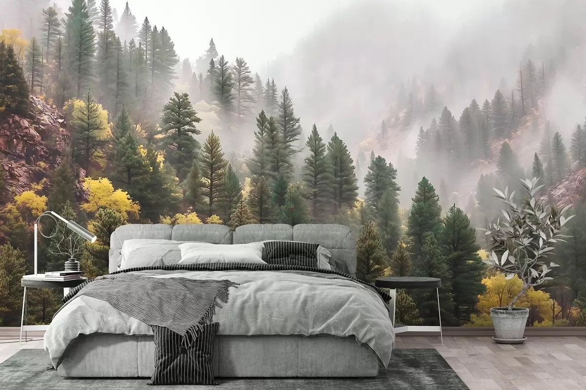 Fototapeter Atmosfærisk tåkete furuskog i fjellene Nr. w09463