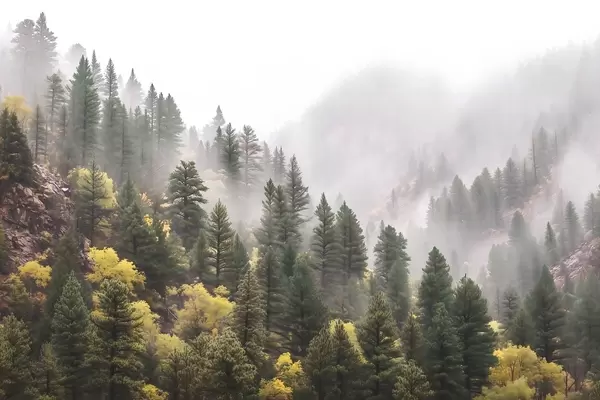 Fototapeter Atmosfærisk tåkete furuskog i fjellene Nr. w09463