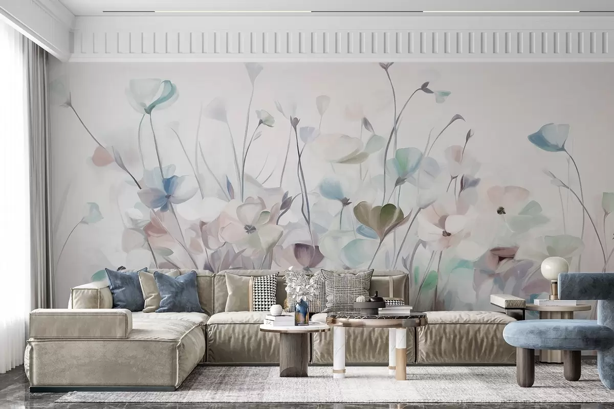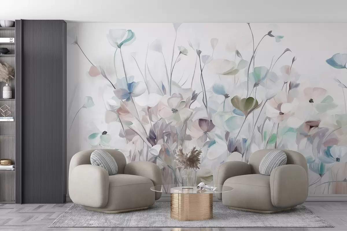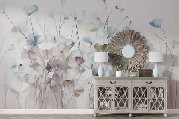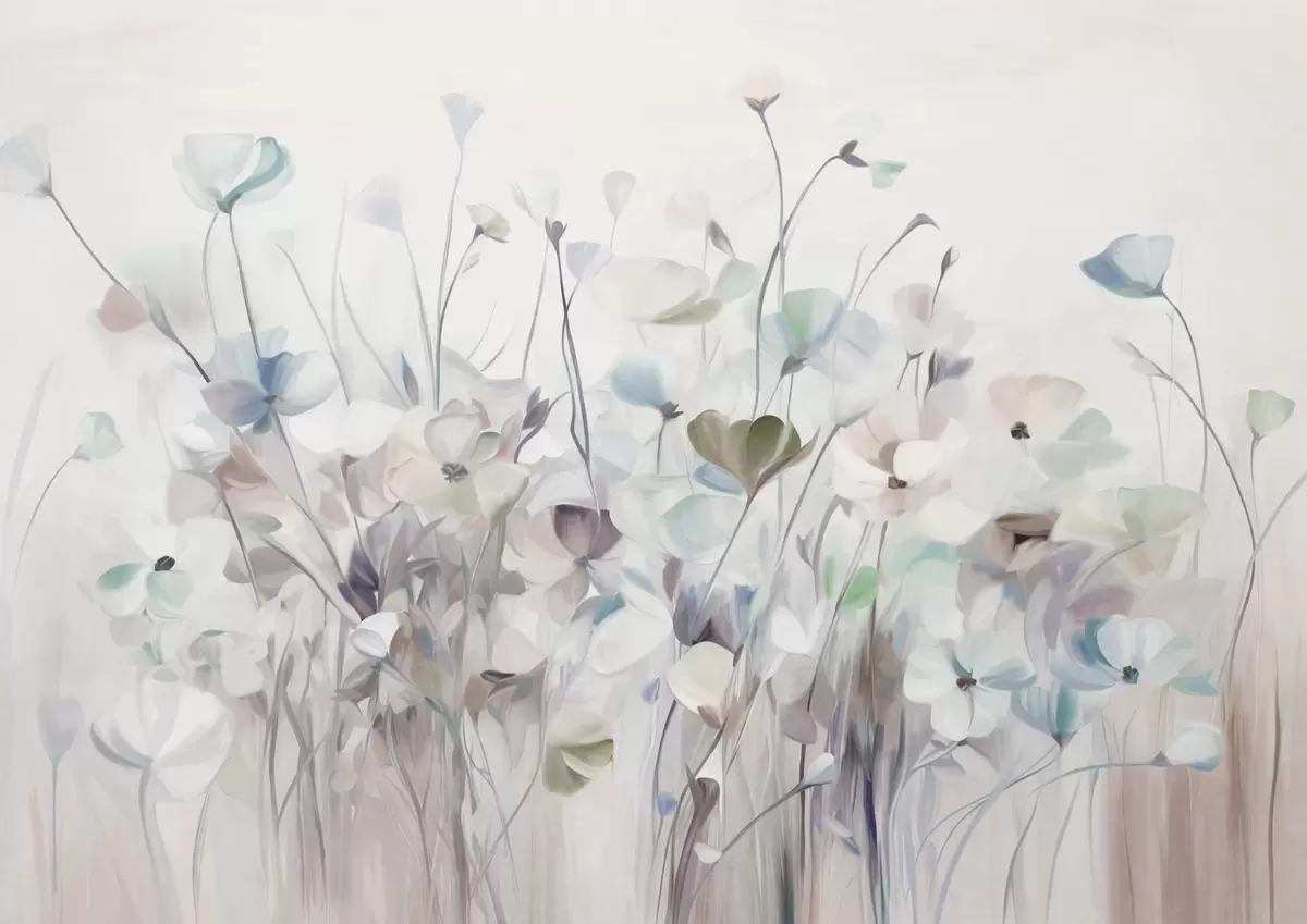 Fototapeter Abstrakt felt med blå og brune blomster med lange stilker og blader, strukturert, pastellfarger, dempede farger Nr. w09466v1
