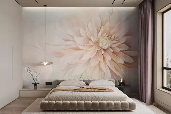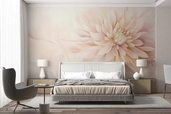 Fototapeter En lyserosa dahlia-blomst med mange kronblader, myk teksturert pastellbakgrunn med innslag av grønt og beige Nr. w09470