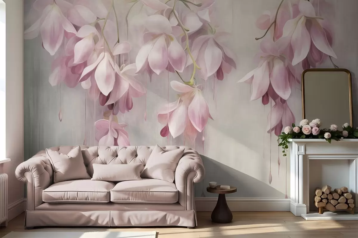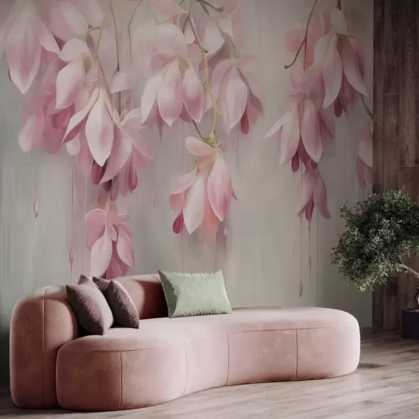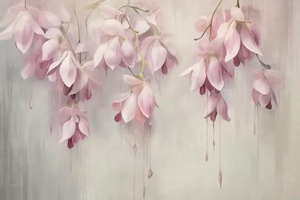 Fototapeter Hengende rosa blomster, lysegrå bakgrunn, blomstermønstret arrangement, botanisk kunst, pastellfarger Nr. w09471
