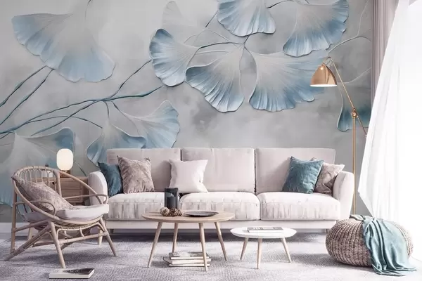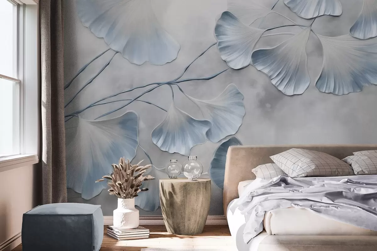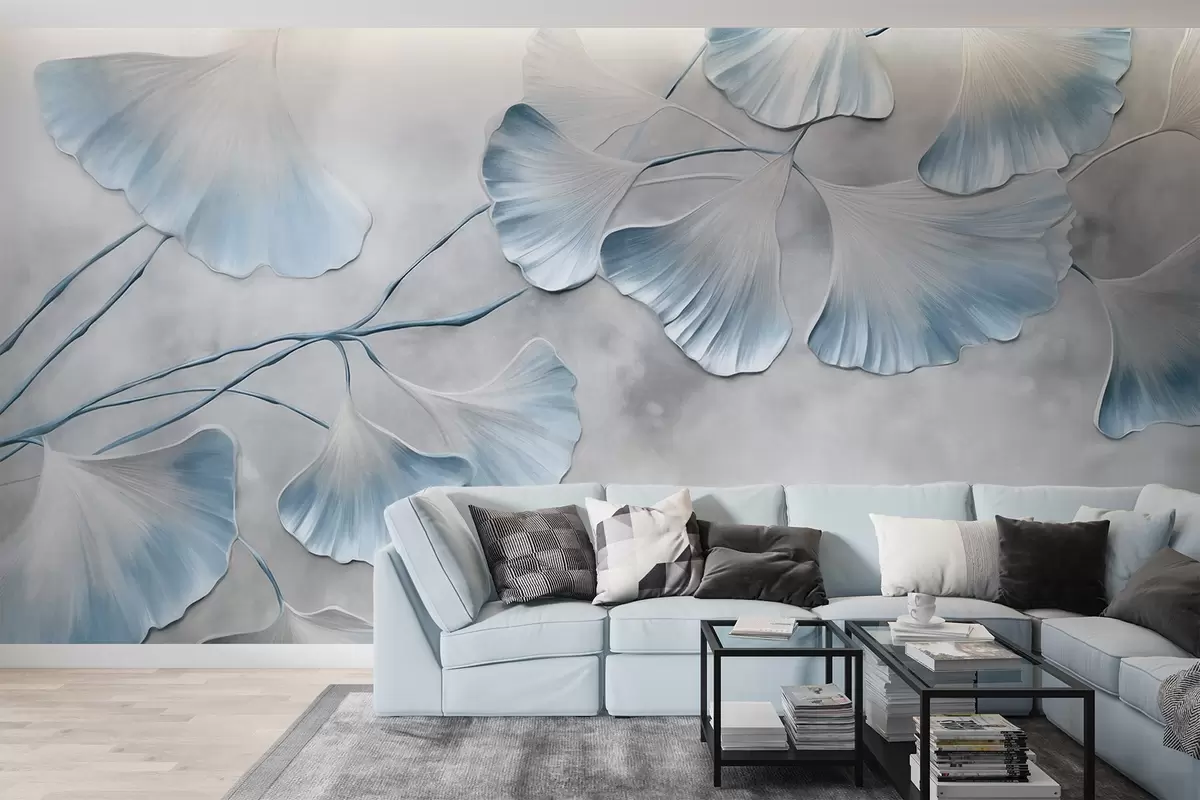 Fototapeter Ginkgo biloba-blader med blå kanter på en gren, grå strukturert bakgrunn, elegant og minimalistisk design Nr. w09472v1
