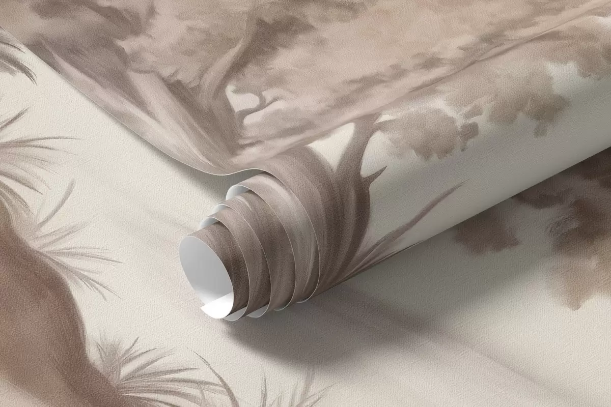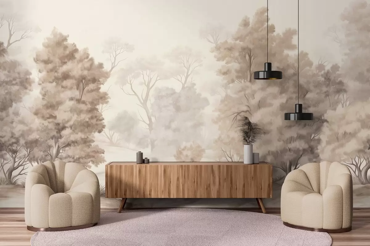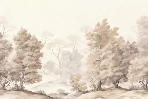 Fototapeter Teksturert landskapsmaleri som imiterer en skog med høye trær og gress, dempede og myke farger, beroligende scene Nr. w09474