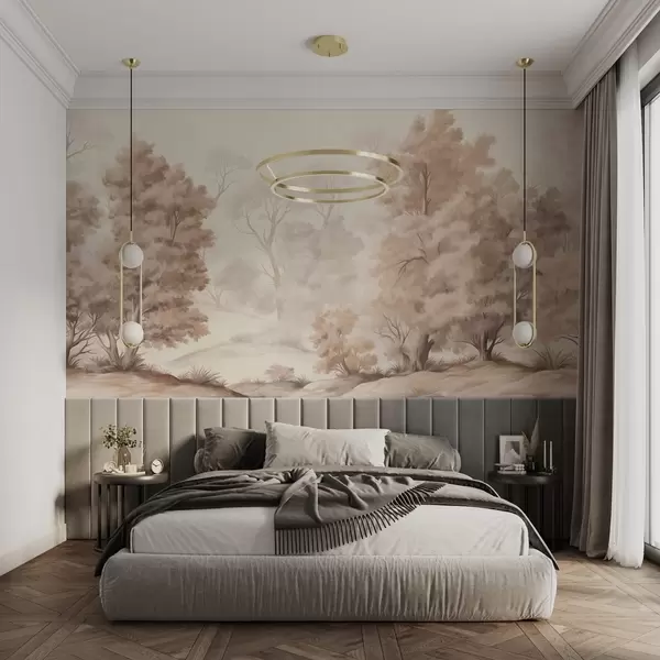 Fototapeter Teksturert landskapsmaleri som imiterer en skog med høye trær og gress, dempede og myke farger, beroligende scene Nr. w09474