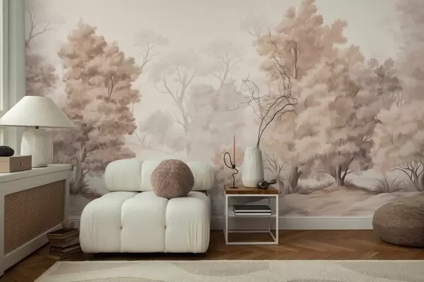 Fototapeter Teksturert landskapsmaleri som imiterer en skog med høye trær og gress, dempede og myke farger, beroligende scene Nr. w09474
