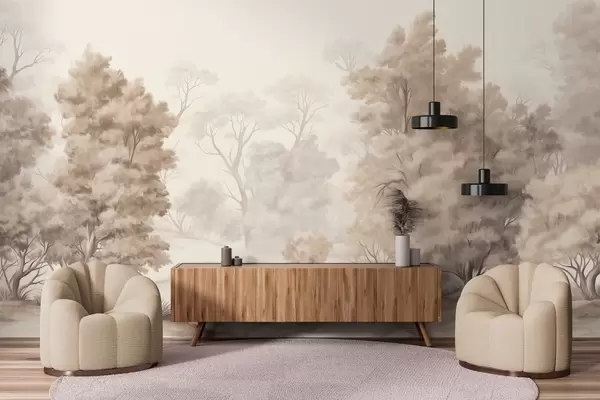 fototapeter Teksturert landskapsmaleri som imiterer en skog med høye trær og gress, dempede og myke farger, beroligende scene w09474