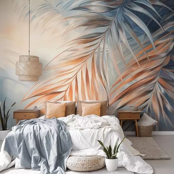Fototapeter Palmeblader med oransje og blå toner, lys strukturert bakgrunn med myke farger, elegant tropisk stil Nr. w09475