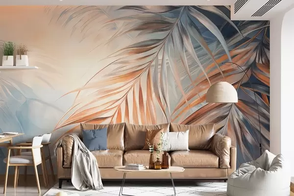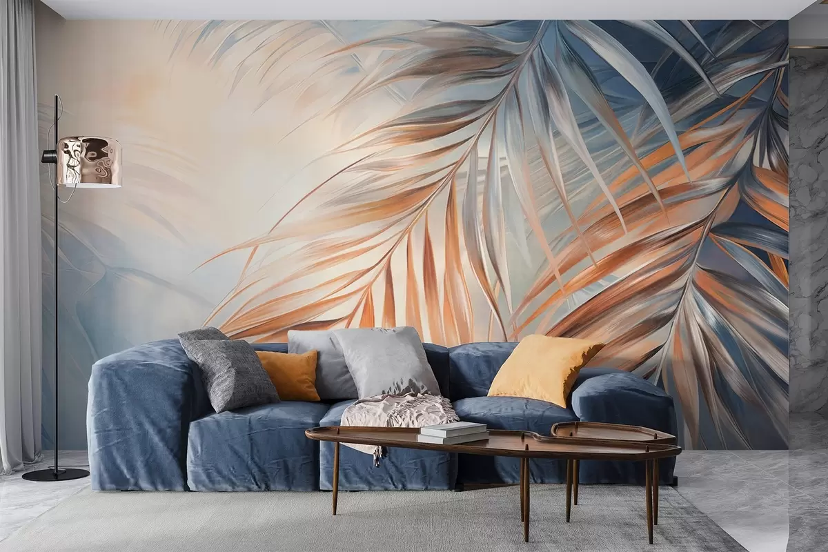 Fototapeter Palmeblader med oransje og blå toner, lys strukturert bakgrunn med myke farger, elegant tropisk stil Nr. w09475