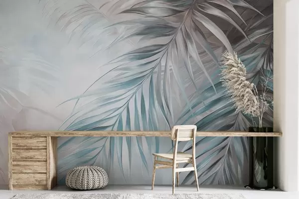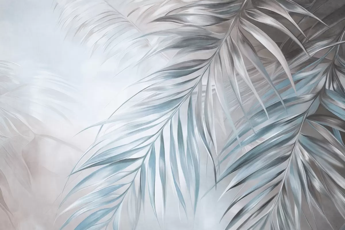 Fototapeter Palmeblader med grå og blå toner, lys strukturert bakgrunn med myke farger, elegant tropisk stil Nr. w09475v1