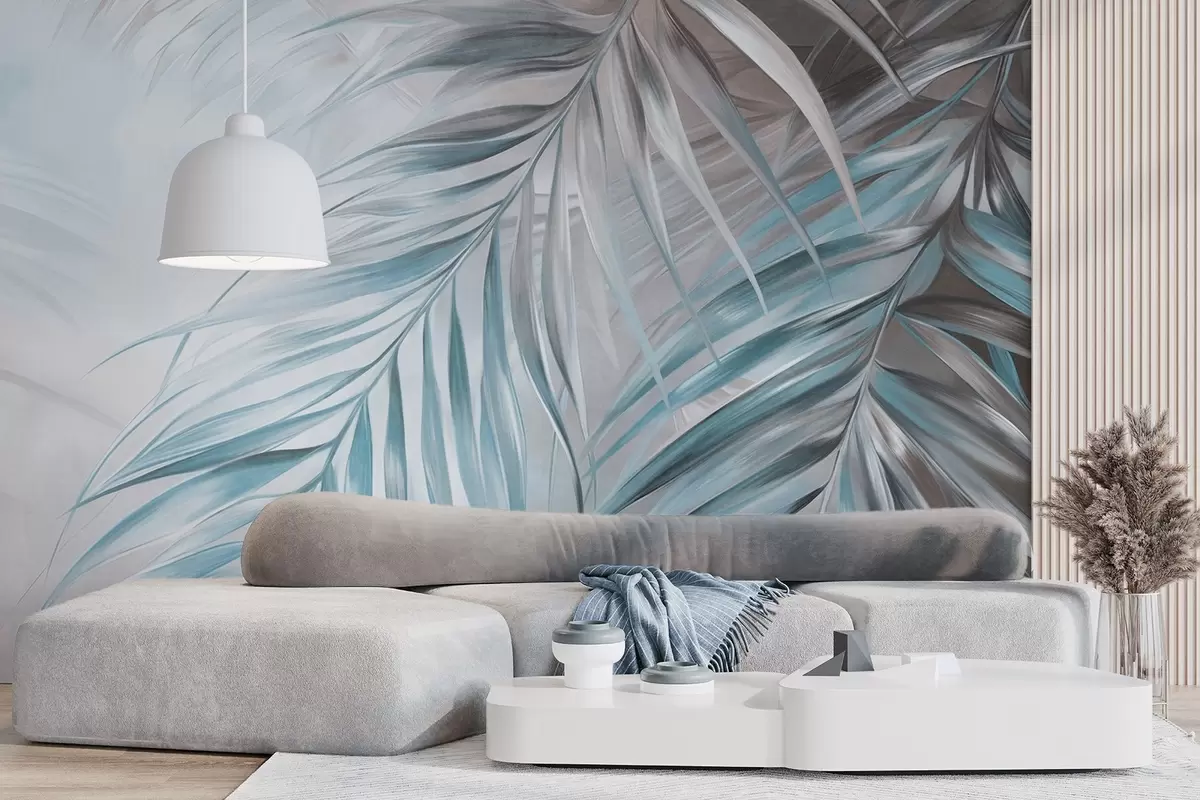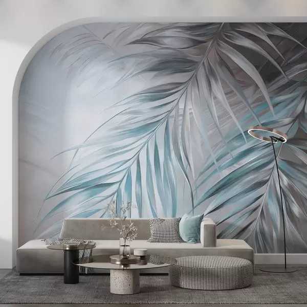 Fototapeter Palmeblader med grå og blå toner, lys strukturert bakgrunn med myke farger, elegant tropisk stil Nr. w09475v1