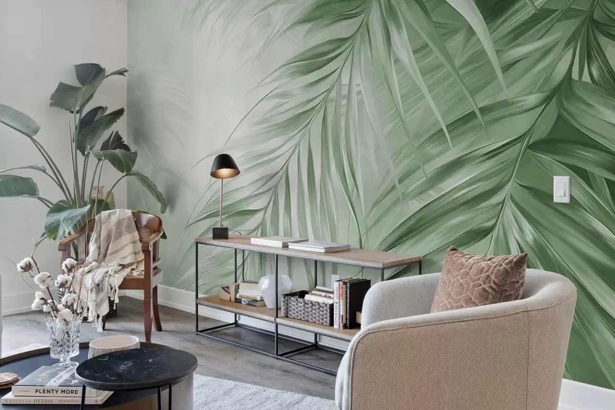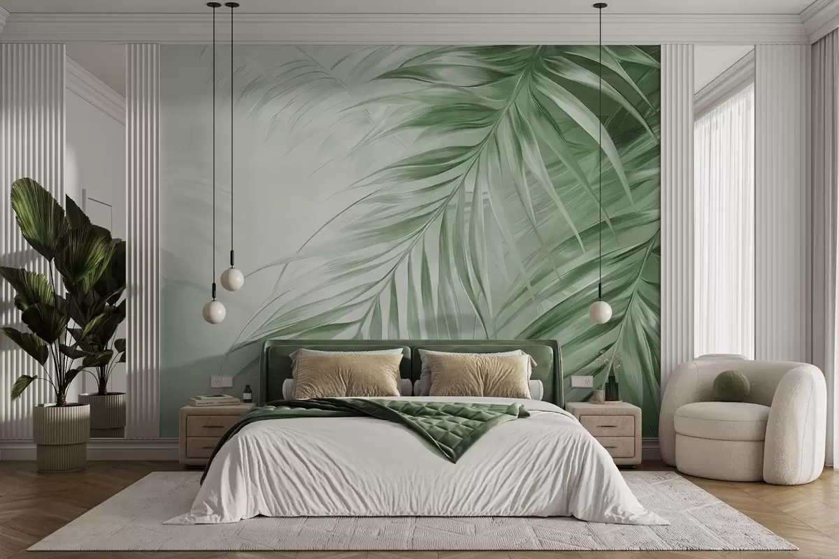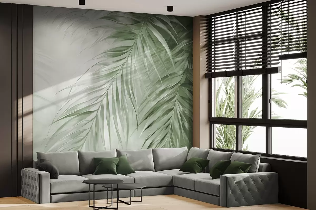 Fototapeter Palmeblader med grønne toner, lys strukturert bakgrunn med myke farger, elegant tropisk stil Nr. w09475v2