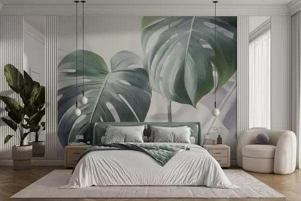 Fototapeter Teksturerte monstera-blader, store og grønne, mot en myk, lys abstrakt bakgrunn Nr. w09477