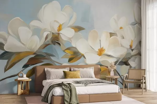 Fototapeter Hvite magnoliaer med grønne blader på en lyseblå bakgrunn med abstrakte penselstrøk Nr. w09478
