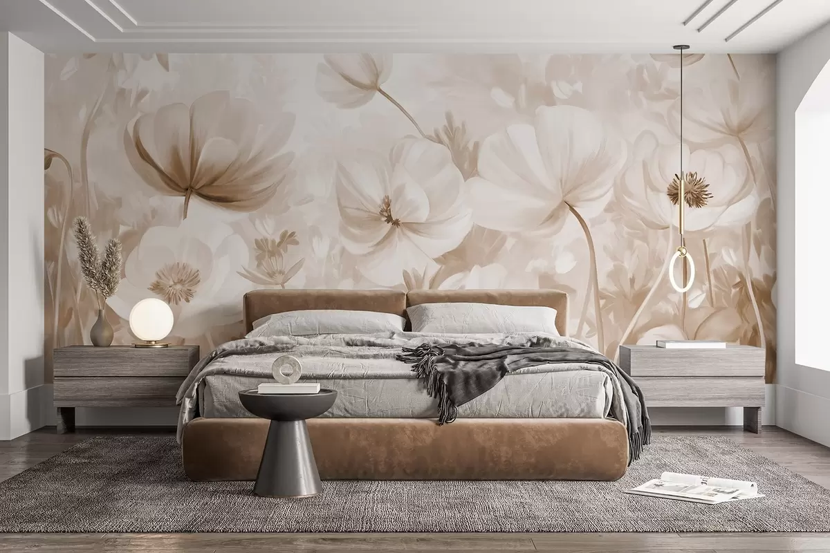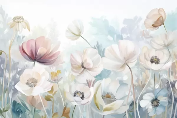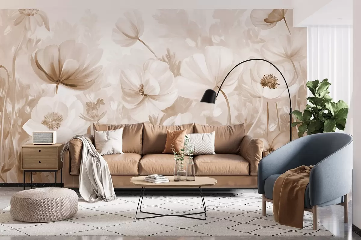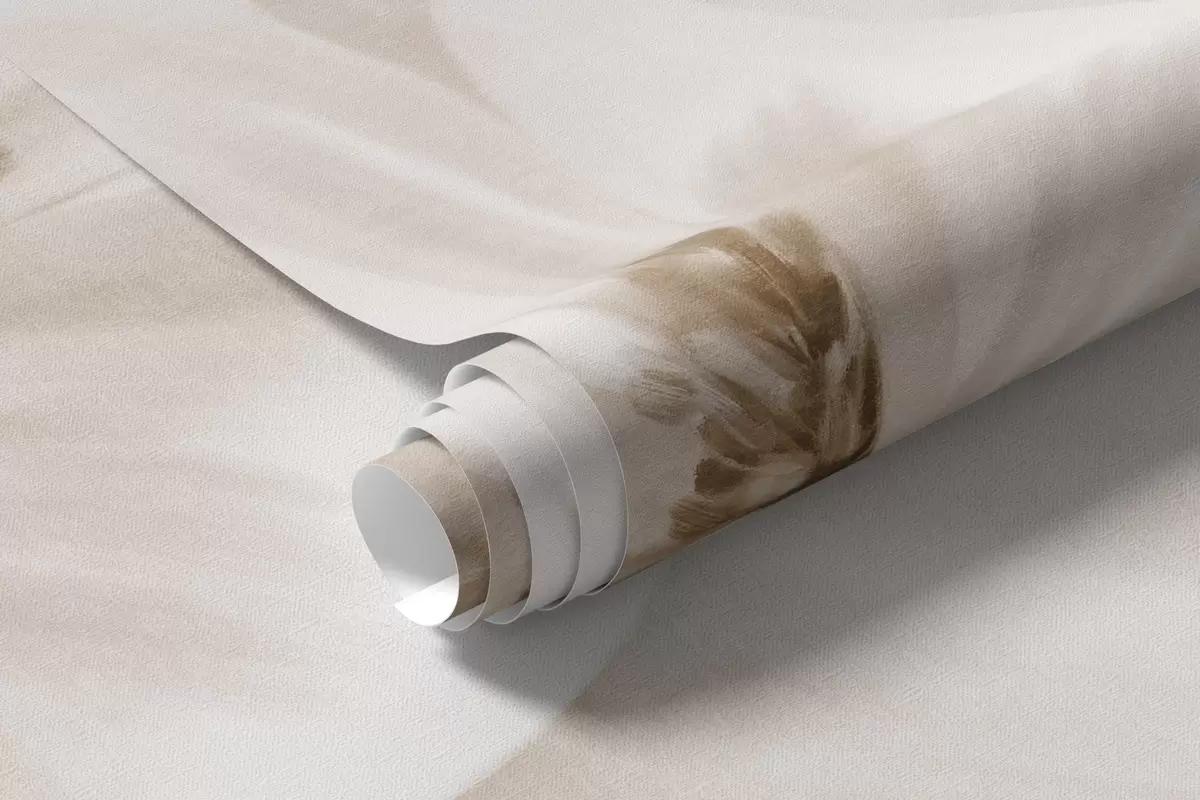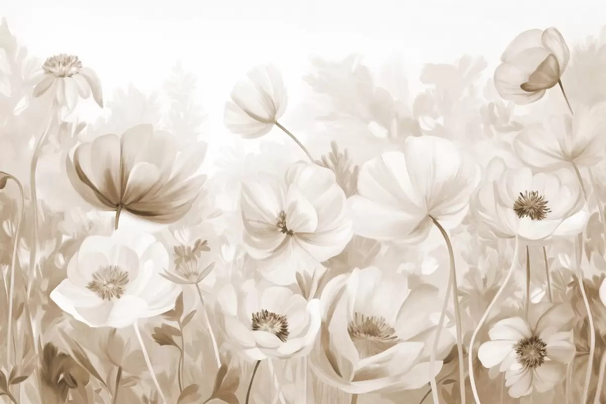 Fototapeter Et felt med beige blomster med delikate kronblader, myke brune blader, i en drømmende, strukturert akvarellstil Nr. w09481v1