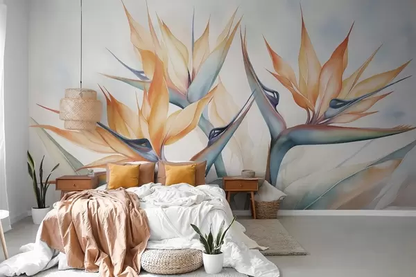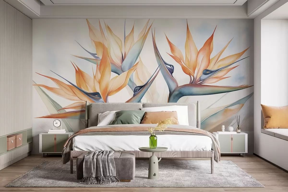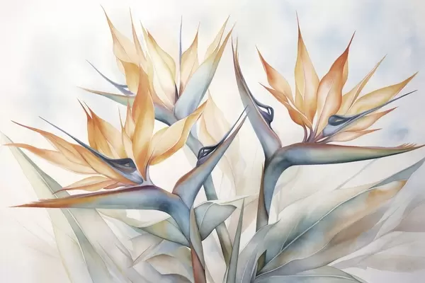Fototapeter Paradisfuglblomst, strelitzia med oransje kronblader, myk akvarelltekstur, lys bakgrunn Nr. w09483