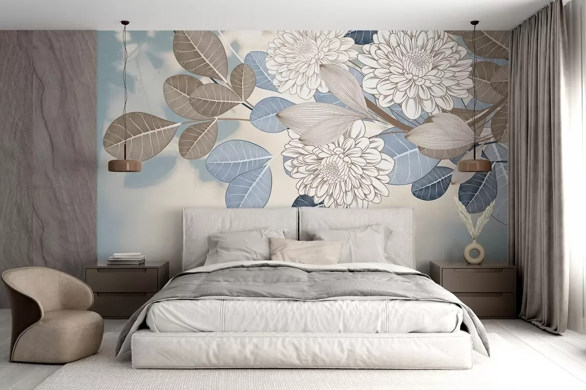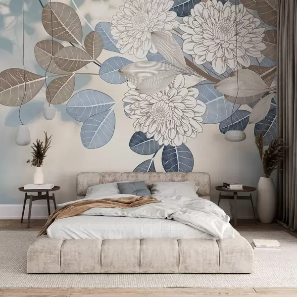 Fototapeter Hvite blomster med blå og brune blader, lyseblå strukturert bakgrunn, blomsteroppsats, detaljert strektegning Nr. w09496