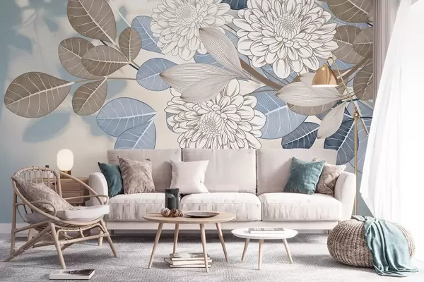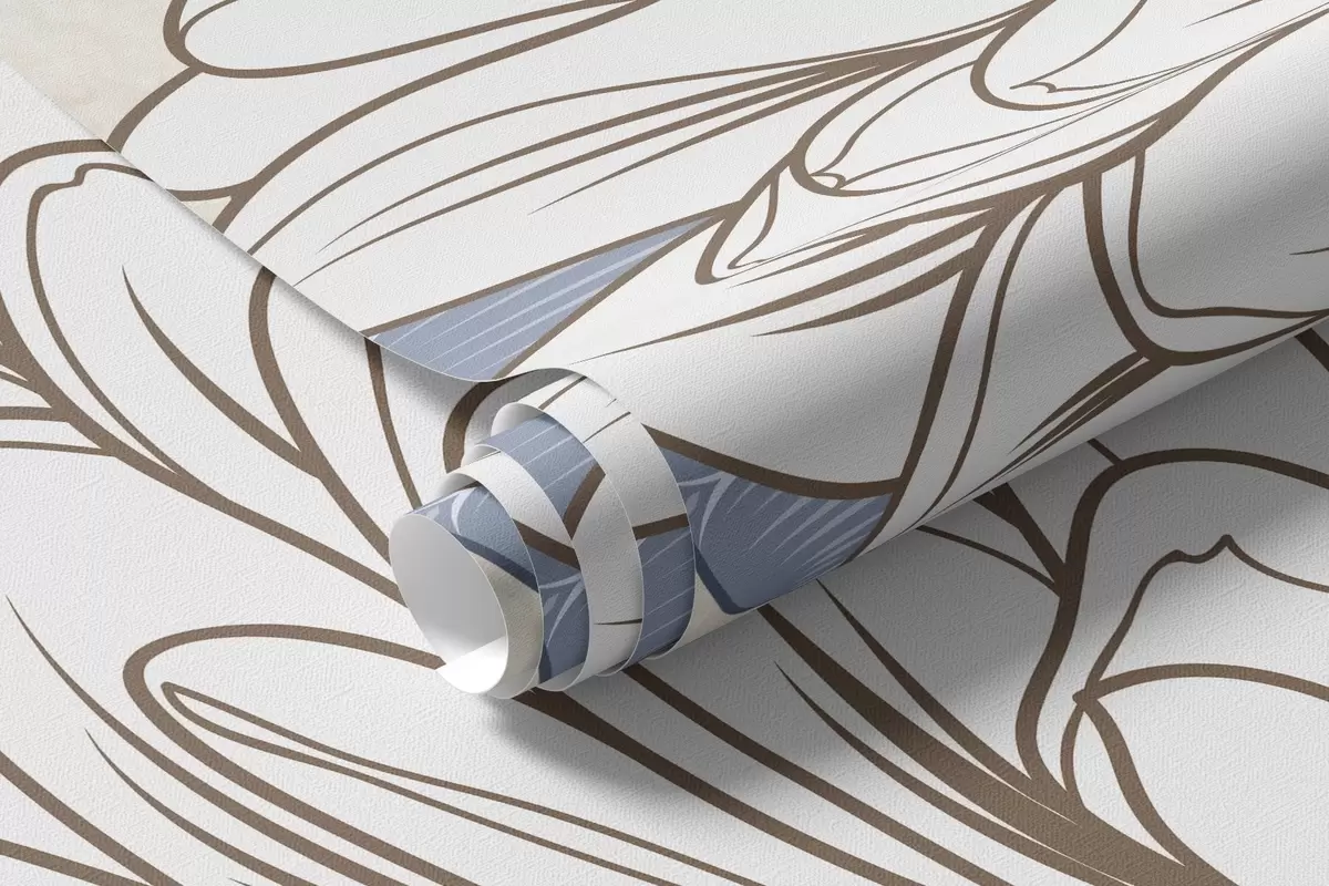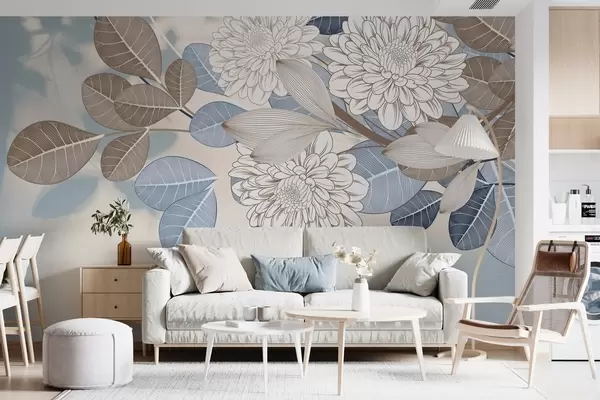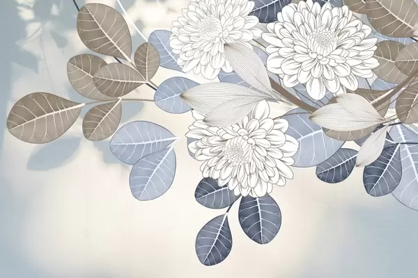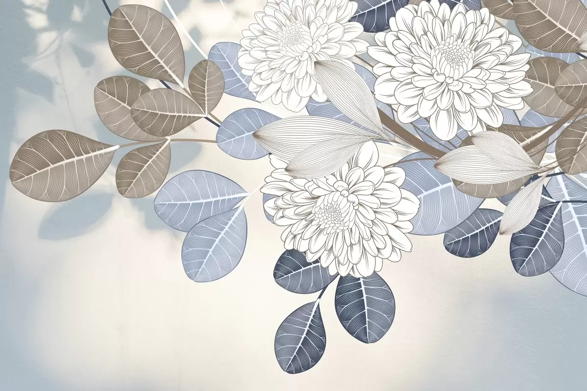 Fototapeter Hvite blomster med blå og brune blader, lyseblå strukturert bakgrunn, blomsteroppsats, detaljert strektegning Nr. w09496