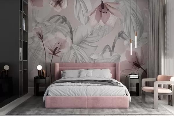 Fototapeter Rosa blomster og grå blader, botanisk blomsterbakgrunn, elegant design, myke farger, lette, delikate detaljer Nr. w09497