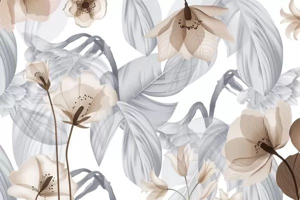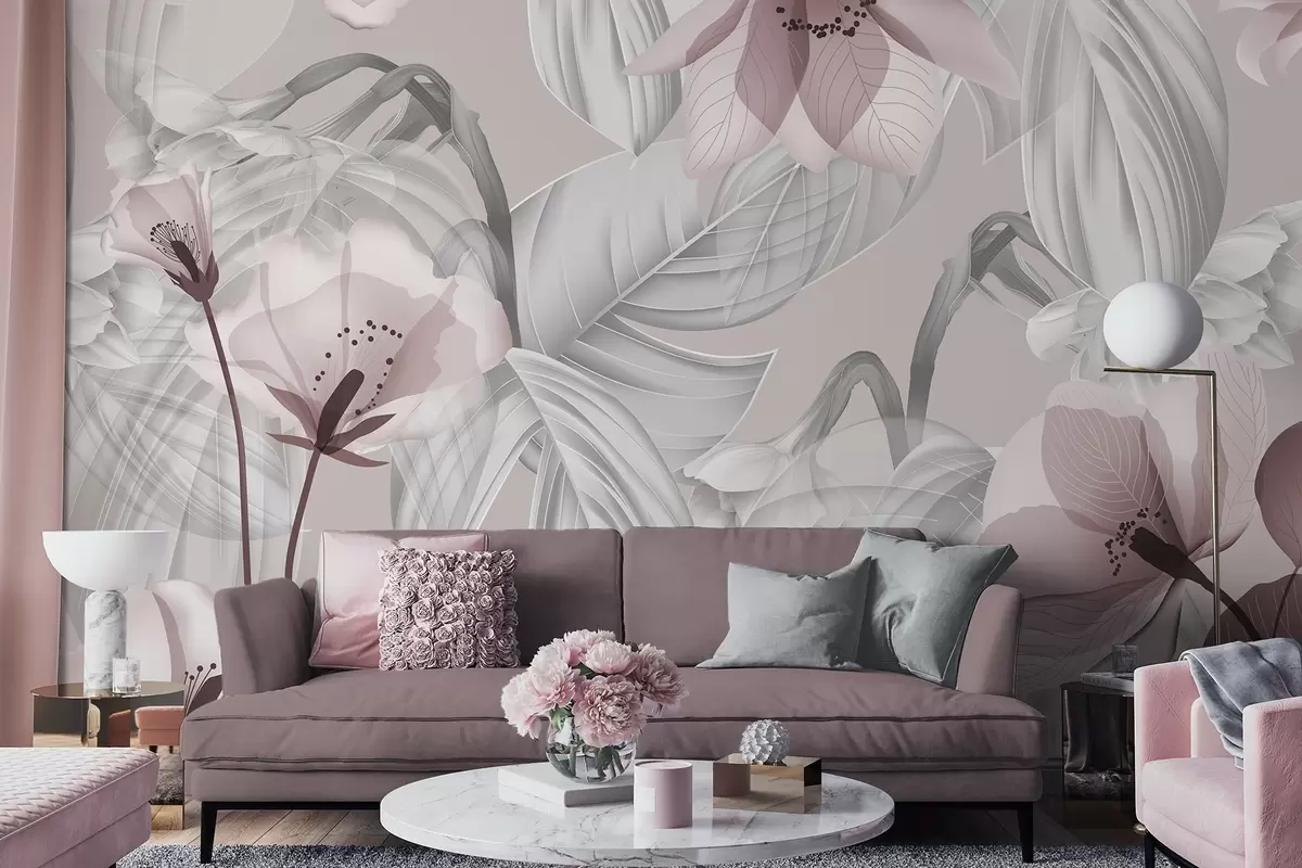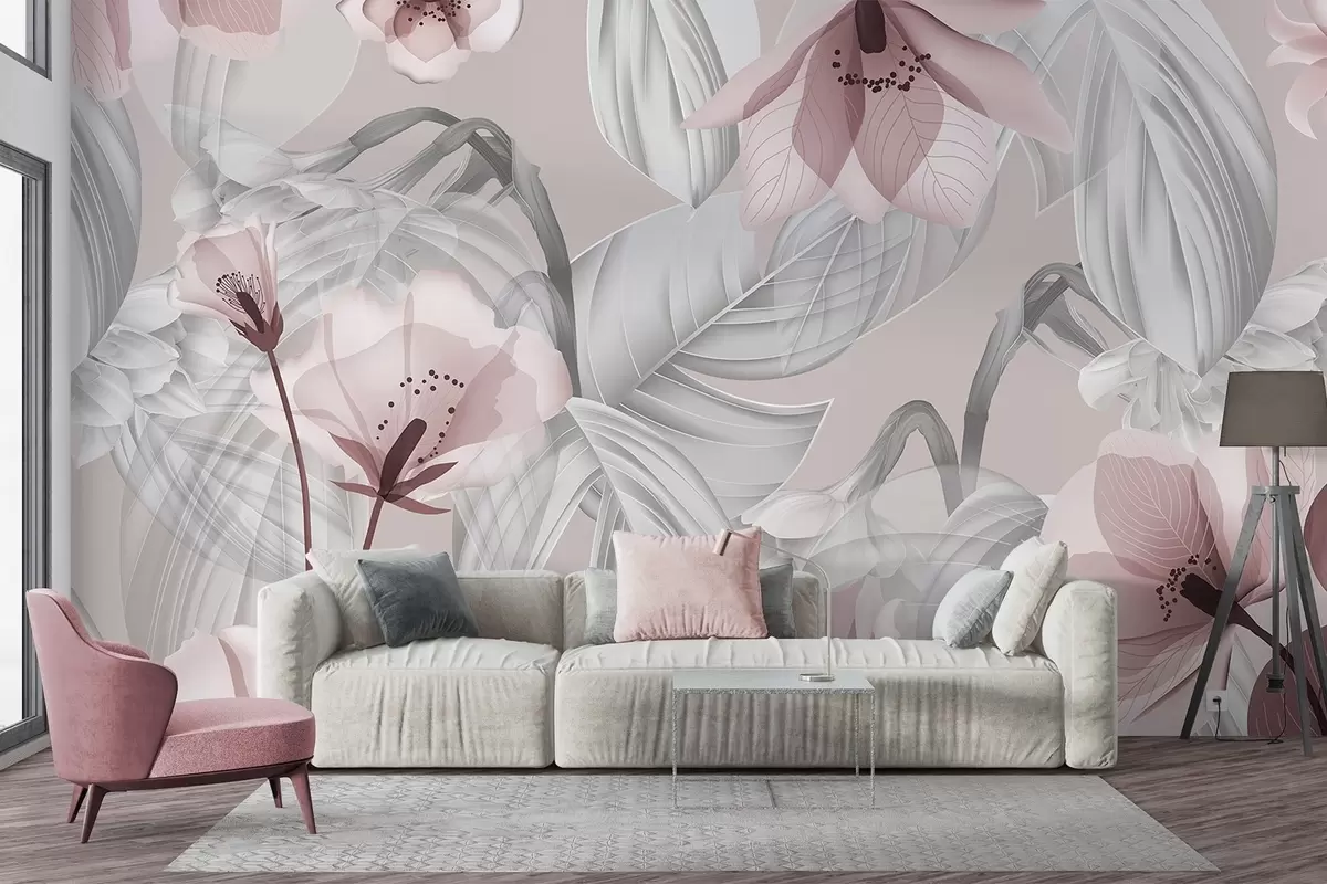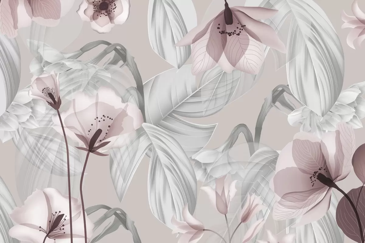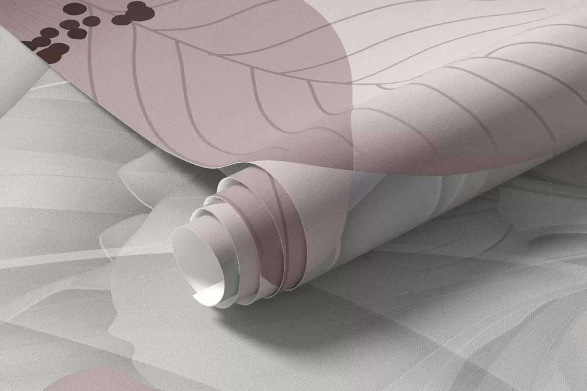 Fototapeter Rosa blomster og grå blader, botanisk blomsterbakgrunn, elegant design, myke farger, lette, delikate detaljer Nr. w09497