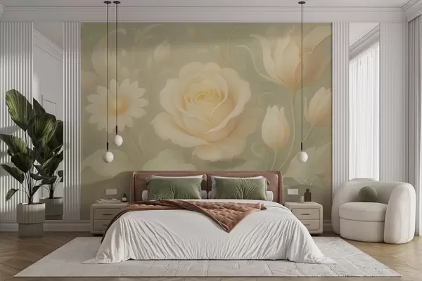 Fototapeter Delikat vintage-komposisjon med beige roser på lysegrønn bakgrunn Nr. w09499
