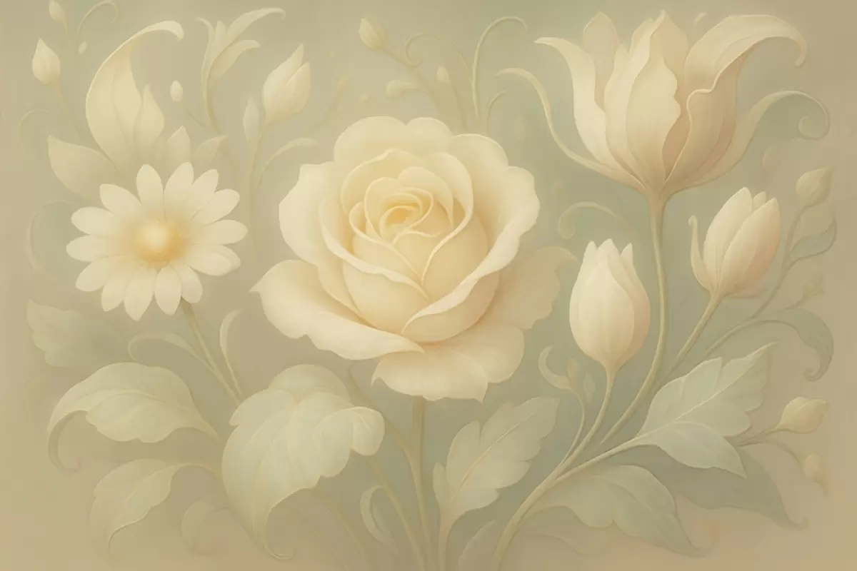 Fototapeter Delikat vintage-komposisjon med beige roser på lysegrønn bakgrunn Nr. w09499