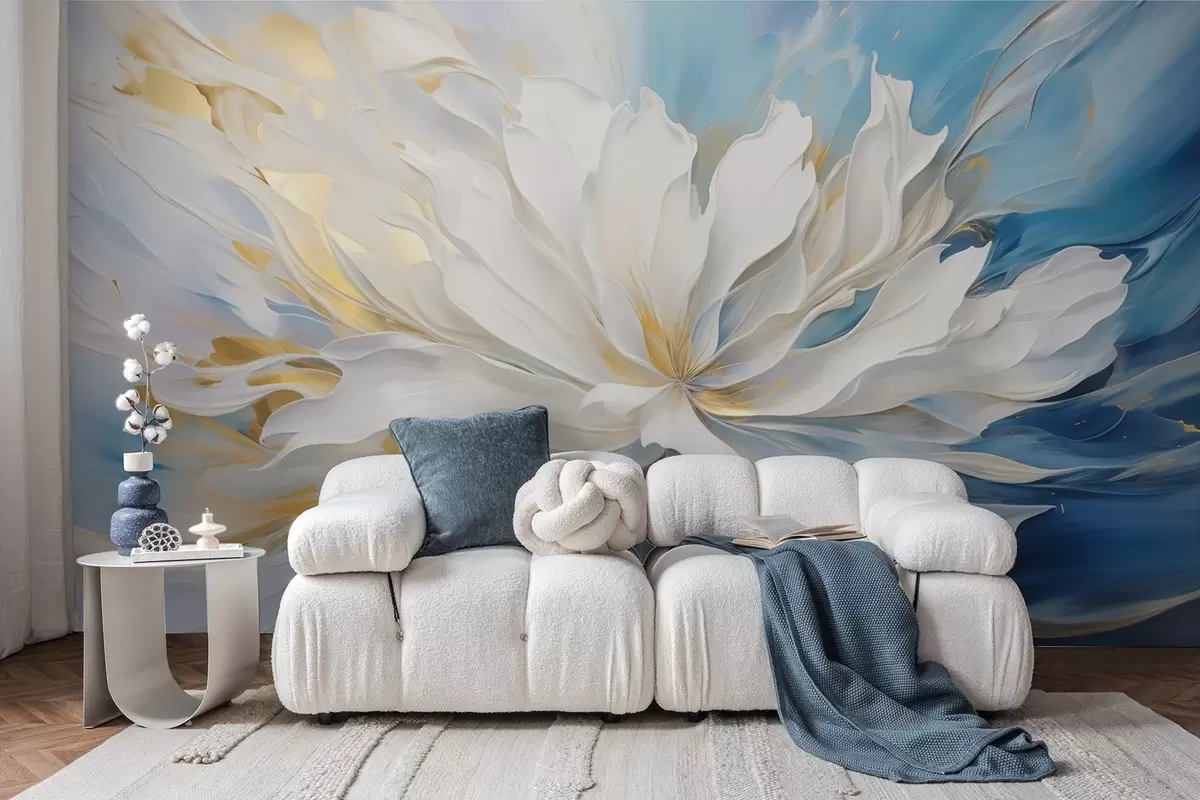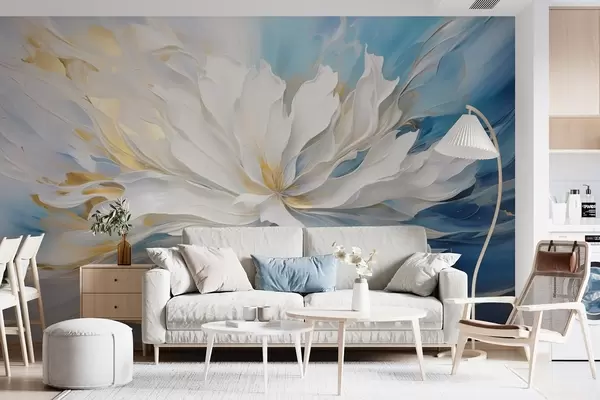 Fototapeter Stor hvit pion i oljemaleri-stil på blå-gul bakgrunn Nr. w09511